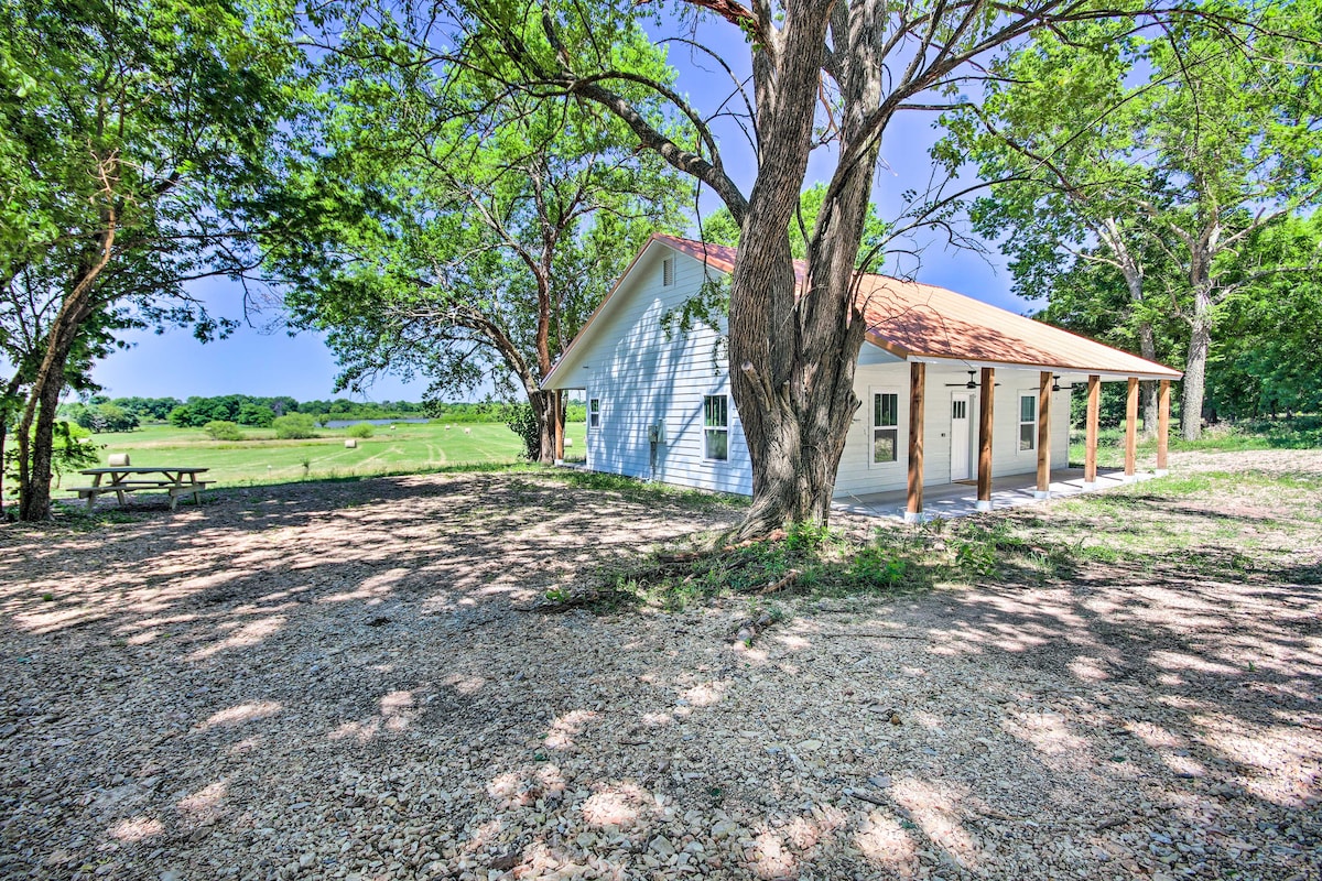 Hilltop Wooded Bliss Relax with the family at this peaceful, tree-lined retreat featuring a fully fenced yard for pets, a spacious deck, and a cozy firepit. Just 1/4 mile to the water depending on water level, 1.2 miles to Hi-Lift Marina, and 2.1 miles to Lakemont. Located on a quiet rural gravel road near trails, only 7 miles from Disney and 30 minutes to Downtown Grove. Set directly on the OK Green Country Adventure Trail. Enjoy a fully stocked kitchen for easy meals after your adventures.