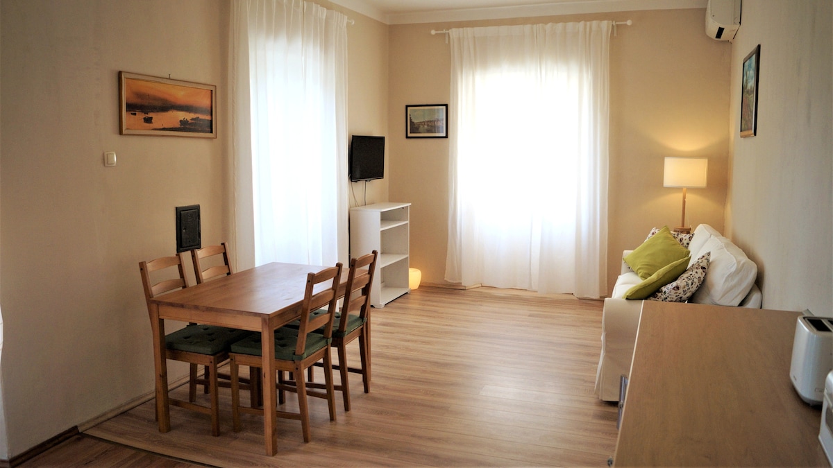 Apartment in a house in Piran with a large garden and an amazing view. Only a 5-minute walk to Tartini square, the city center, the grocery store, the beach and to the nearest bus stop. Two parking spaces are available for free (tandem parking - your cars parked one in front of the other). The Piran city tourist tax (3,13€ per adult person per night) is already included in the price.