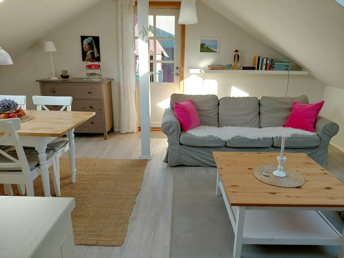 Helle, coole Galeriewohnung mit fantastischem Meerblick und Balkon. Liebevoll eingerichtet. Ruhig gelegen direkt gegenüber dem schönen Sandstrand. Mit großem Panoramafenster und Balkon über die gesamte Wohnungsbreite. Oben in der Galerie kann man vom Bett aus den Sternenhimmel sehen. Deckenhöhe am Bett 2,50 m, wird erst bei der gemütlichen Loungecke etwas niedriger.