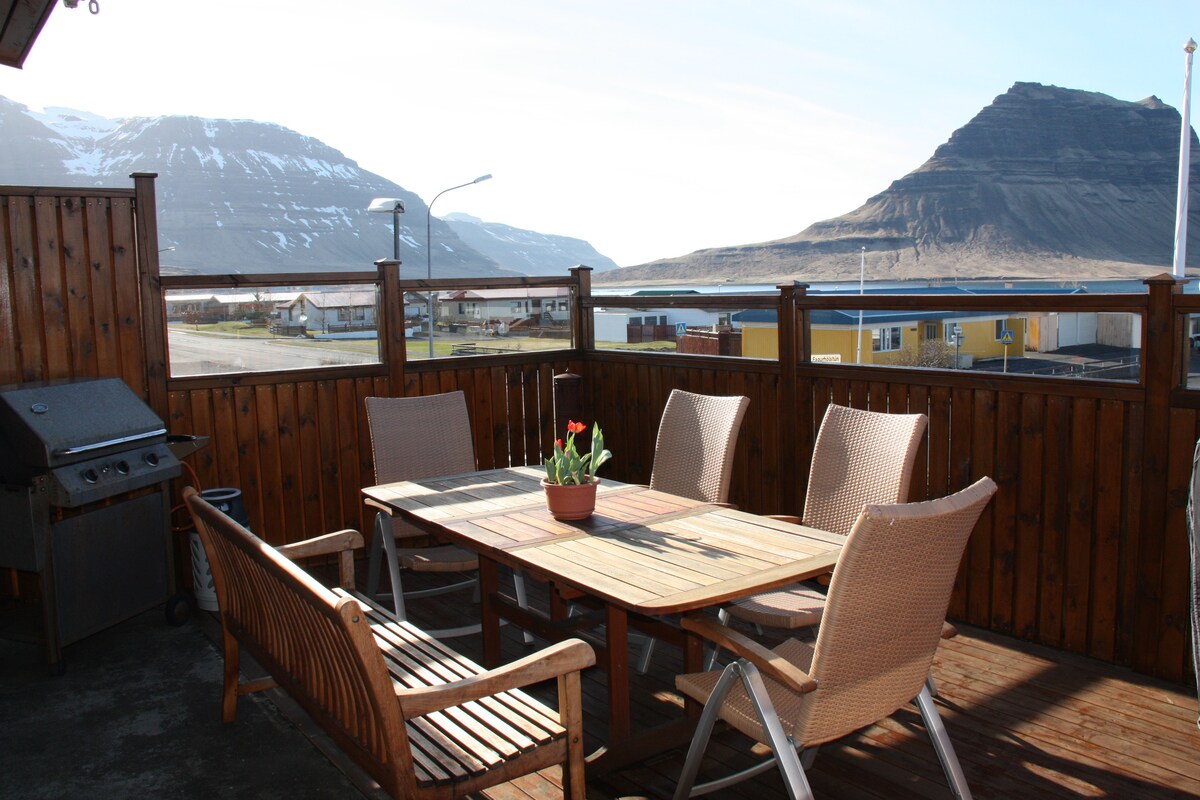 Our peaceful, orca-themed apartment offers a spectacular view over Grundarfjörður and famous Mt. Kirkjufell. In the summer you can watch colorful sunsets and in the wintertime witness the Northern lights in clear skies. The apartment is detached from the main building and includes a well-equipped kitchen (yes, there's coffee and tea), a private bathroom, as well as comfortable beds and a seating area for two people. Supermarket, clinic, swimming pool, and waterfront in walking distance.