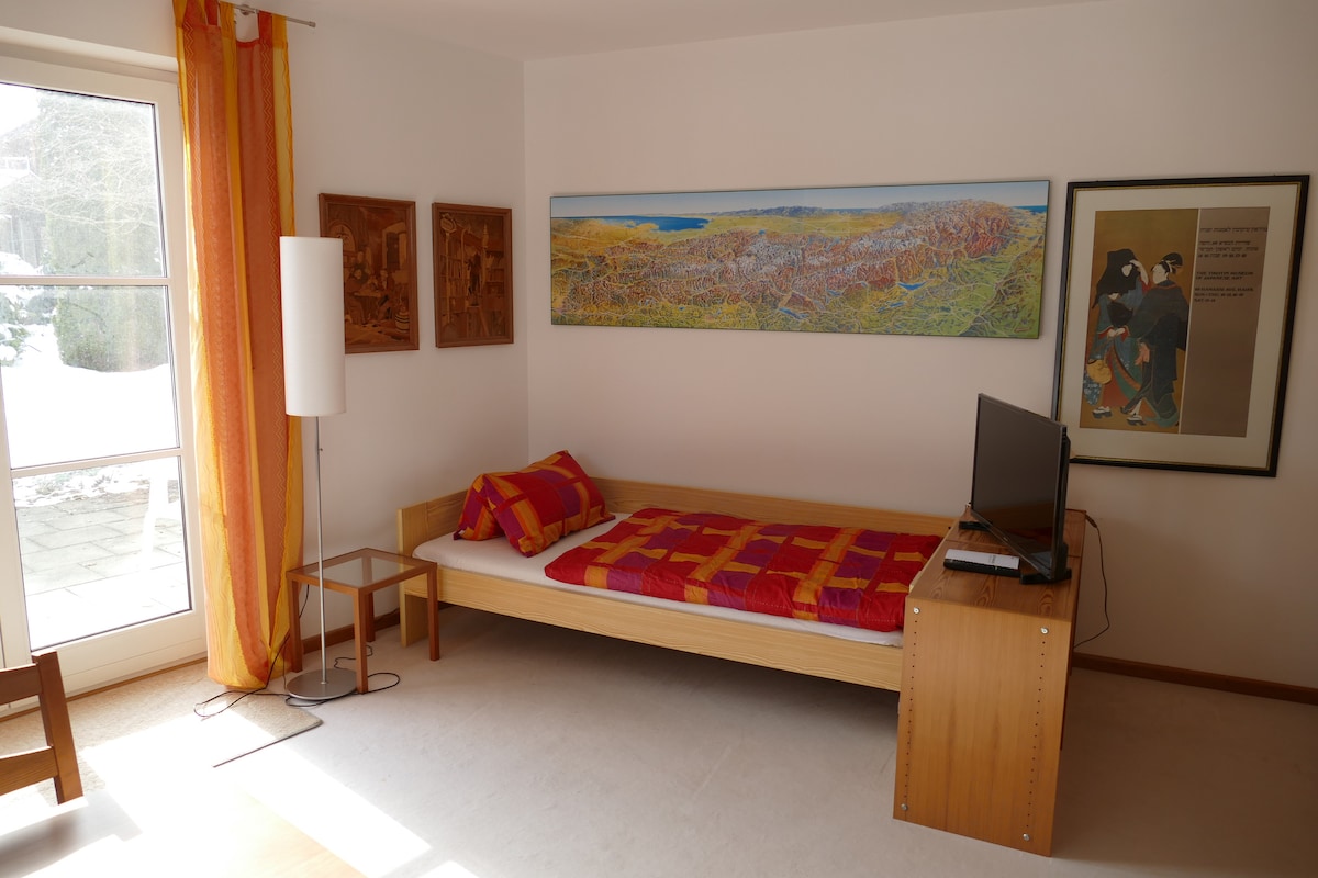 Die Apartement-Wohnung (45 m^2) liegt in einem separaten, ebenerdigen Anbau im Garten des Haupthauses und hat einen eigenen Zugang. Sie liegt im ruhigen Ortsteil Buchenhain der Gemeinde Baierbrunn. Von hieraus ist man schnell in der Münchener City oder in den Alpen. The self-contained appartement is located in the calm district Buchenhain of the community of Baierbrunn some kilometers south of Munich.