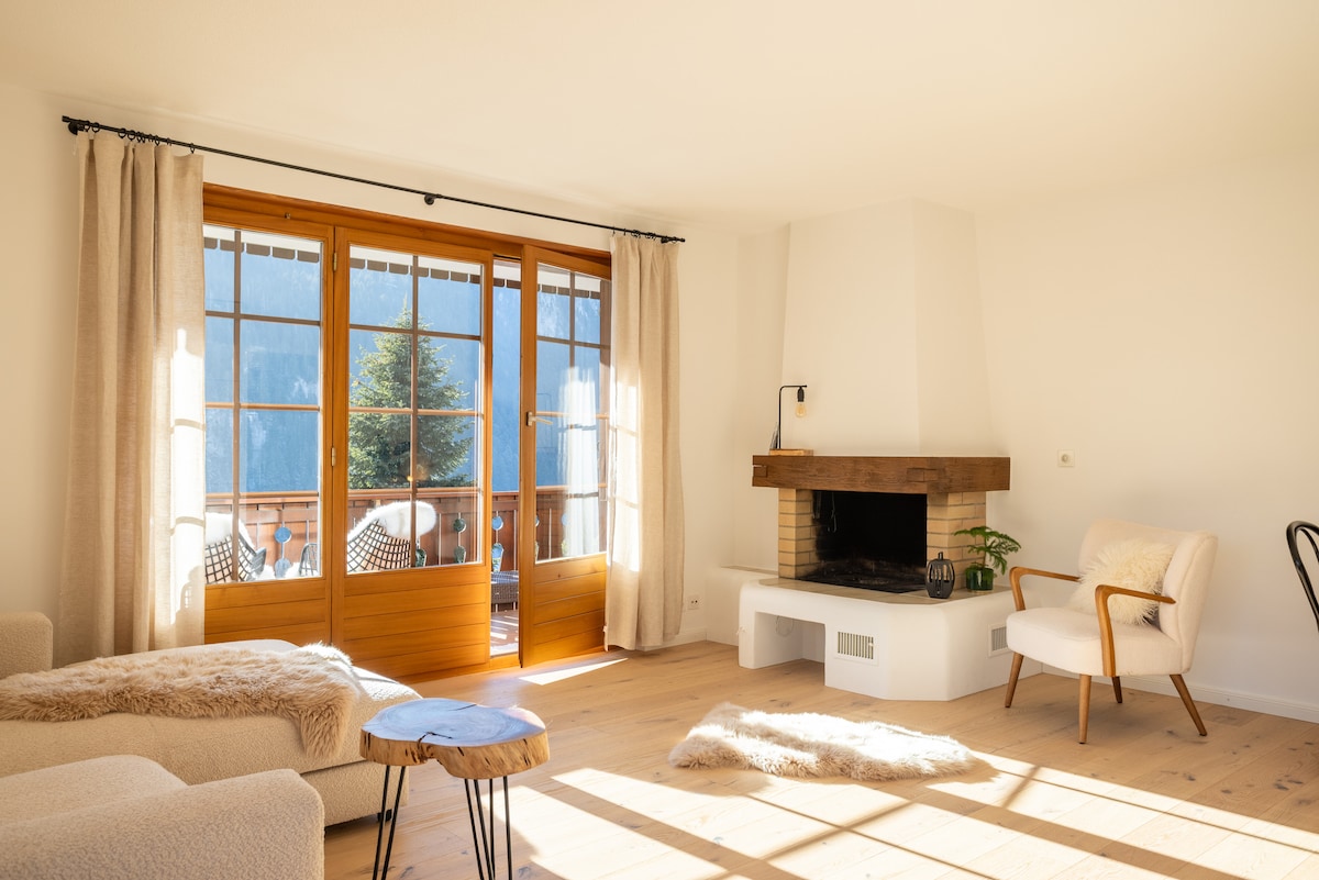 Newly renovated luxury 2 bedroom apartment in Rougemont (Gstaad area) with a large, sun-soaked terrace/garden.8min walk/3min drive to Gstaad ski area slopes & 8min car to Gstaad center-ideal for ski days & evenings in town. Fully renovated in 2022 by local artisans,this apartment combines modern comfort with Alpine charm and luxury touches. It sits in a peaceful,very private residence of just 4 chalets, set ~100m back from the road within private grounds. Parking,ski room,beautiful views #gstaad