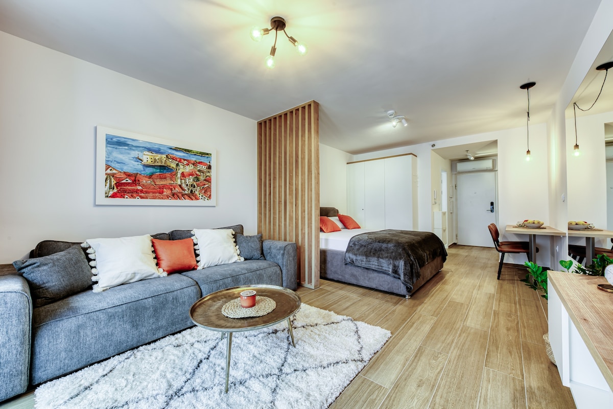 Nave is a new apartment located in a quiet neighbourhood of Ploče. It is 7-10 minutes of walking distance from the Old Town and Banje beach is just down the street. With all amenities inside the apartment we made sure our two guests can have a relaxing stay whether it is by sipping wine on the balcony overlooking the Old Town, Lokrum Island and the sea, or inside the apartment under the AC gazing at the sea.