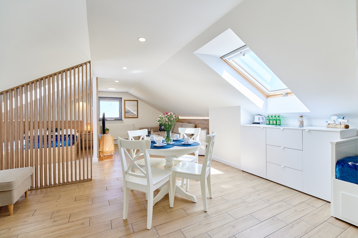 NOWY, KOMFORTOWY, dwupoziomowy, APARTAMENT Parter; salon z kuchnią, drewniany taras i mini ogródek, toaleta, pralka, suszarka, żelazko. Piętro; łazienka z prysznicem, dwie sypialnie, każda z dużym tarasem. Ogrzewanie podłogowe, trzy telewizory, WiFi, łóżeczko dla niemowlęcia + krzesełko, sprzęt plażowy. Grill. Zewnętrzny basen, parking przy wejściu do apartamentu. Teren ogrodzony, oświetlony i monitorowany. ZAKAZ PALENIA TYTONIU I E-papierosów. Obiekt całoroczny, wynajem na minimum 5 dni.