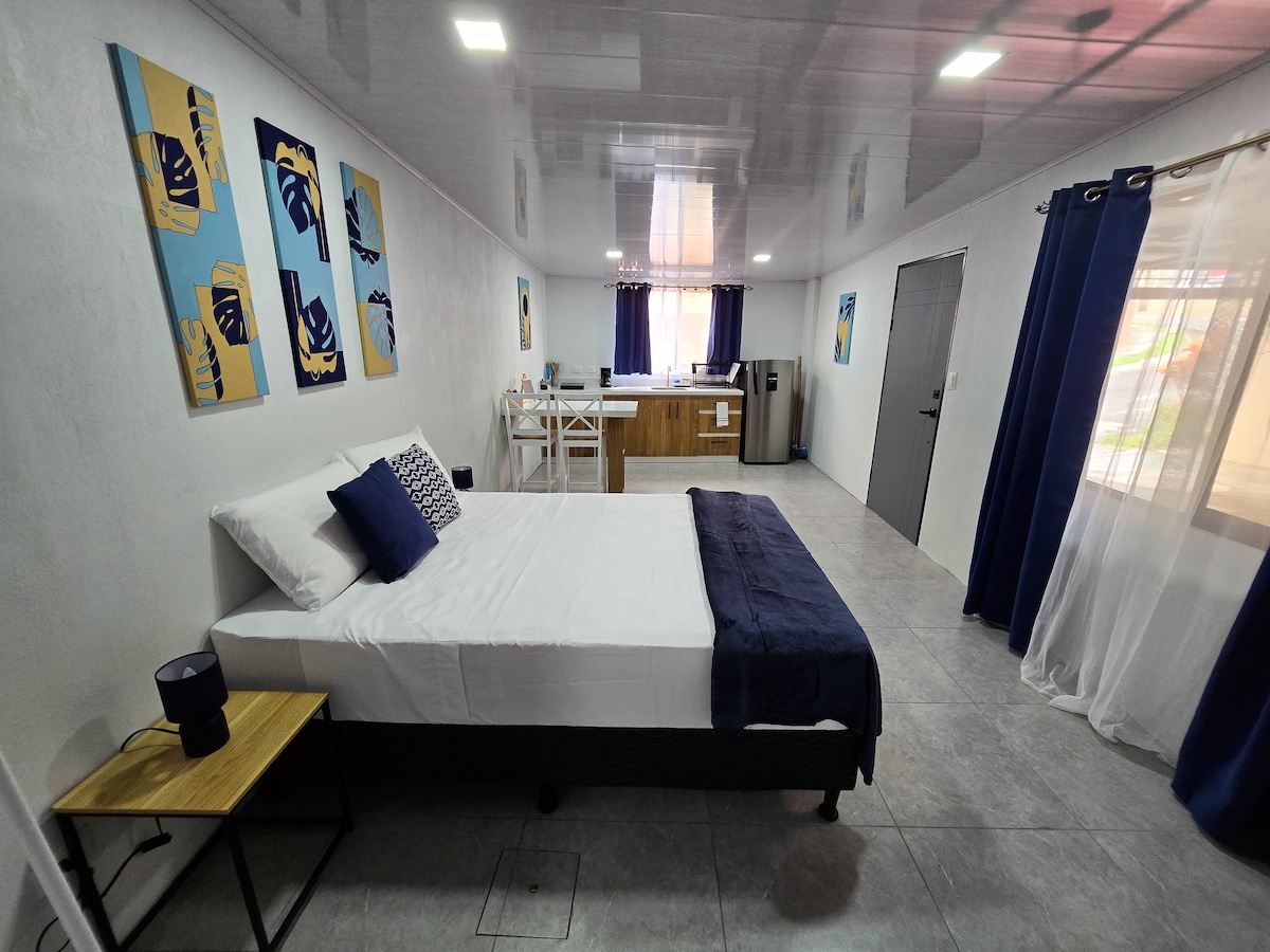 Welcome to our studio apartment, nestled within a secure 5-apartment building. Situated in a safe area, it offers proximity to all amenities. Just a 7-minute drive to SJO airport and a supermarket only 90m away. On-site laundry facilities and a communal area provide added convenience. Enjoy super-fast internet and top-notch WiFi. Plus, Walmart, City Mall, and Plaza Real are all within a 4-5 minute drive.