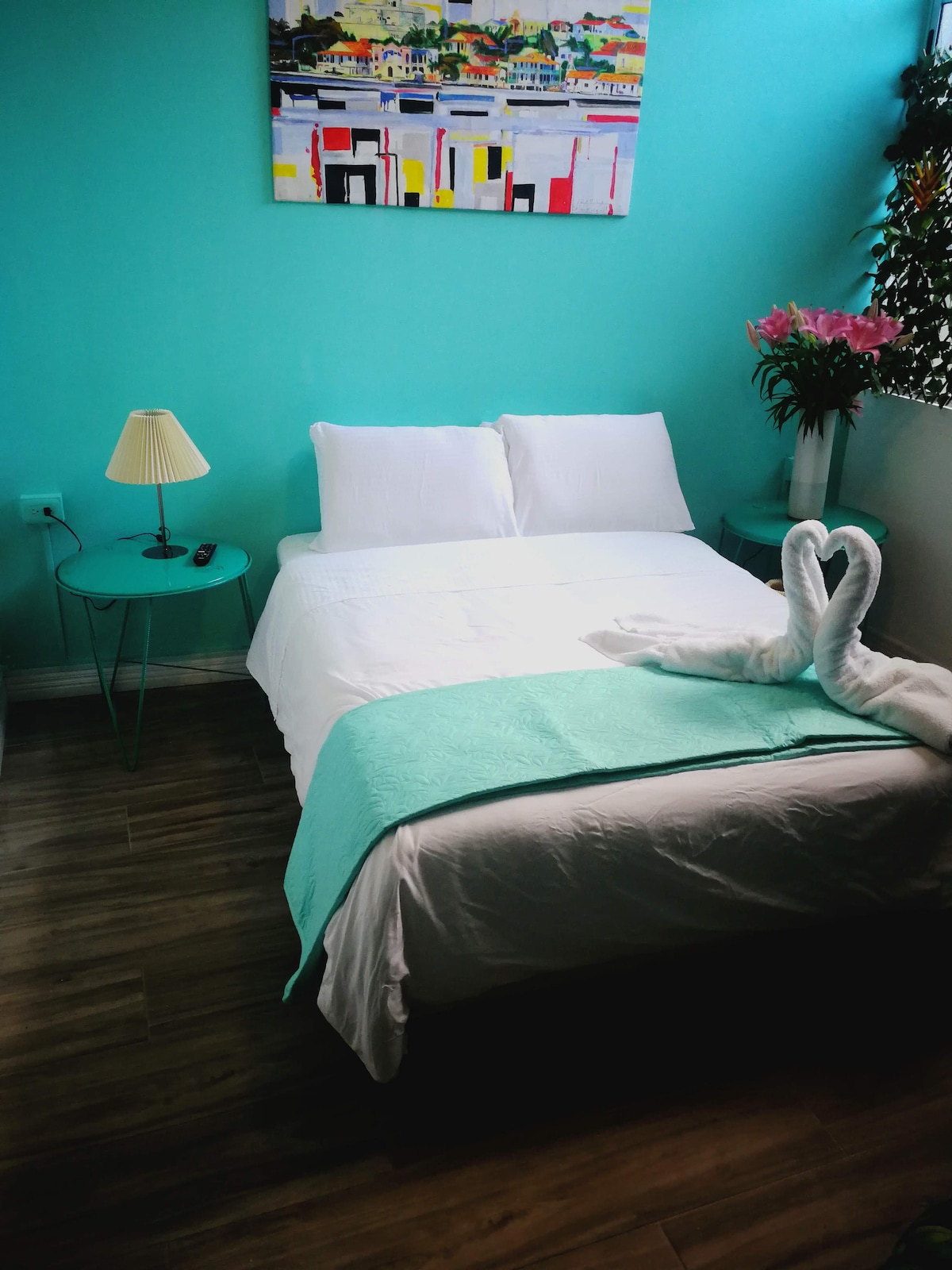舒适的特大号床,非常中心,温馨,干净。