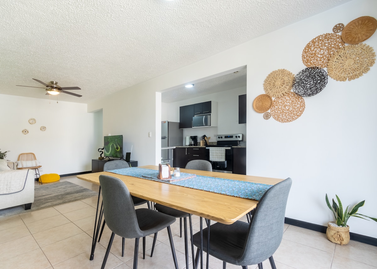Welcome! Enjoy your stay at this cozy 2-bedroom apartment, only a 5min drive away from SJO Airport. The perfect short-stay spot before your adventure or before getting back home. For your comfort, the apartment has: - High speed internet - Air conditioning - 1 Free parking spot - Fully equipped kitchen Enjoy our premises with: - Shared gym, swimming pool and club house - Playground - 24/7 security Only 2 minutes away from the City Mall Alajuela and Walmart.