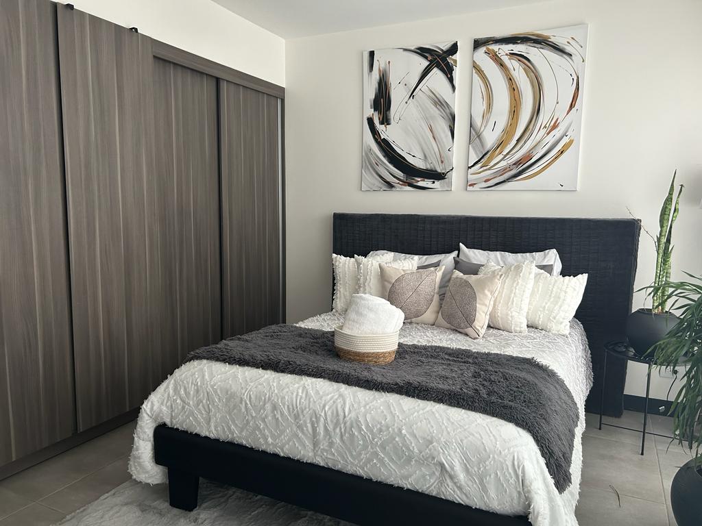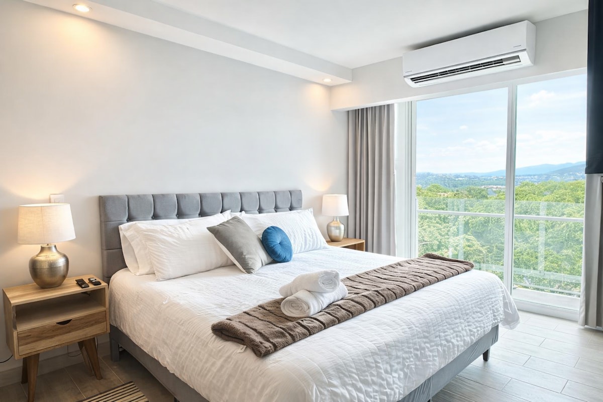 CR Stays Welcomes you to this fully-equipped studio just 4 miles from Juan Santamaría Airport. Enjoy breathtaking views of the Escazú mountains, a king bed, queen sofa bed, fast Wi-Fi, and air conditioning—ideal for 4 guests. The building boasts a gym, pool, BBQ terrace, private cinema, and meeting rooms. Minutes from Plaza Real Cariari’s shops and restaurants, and located in a prime business hub. 24/7 security for a safe, stylish, and comfortable stay.
