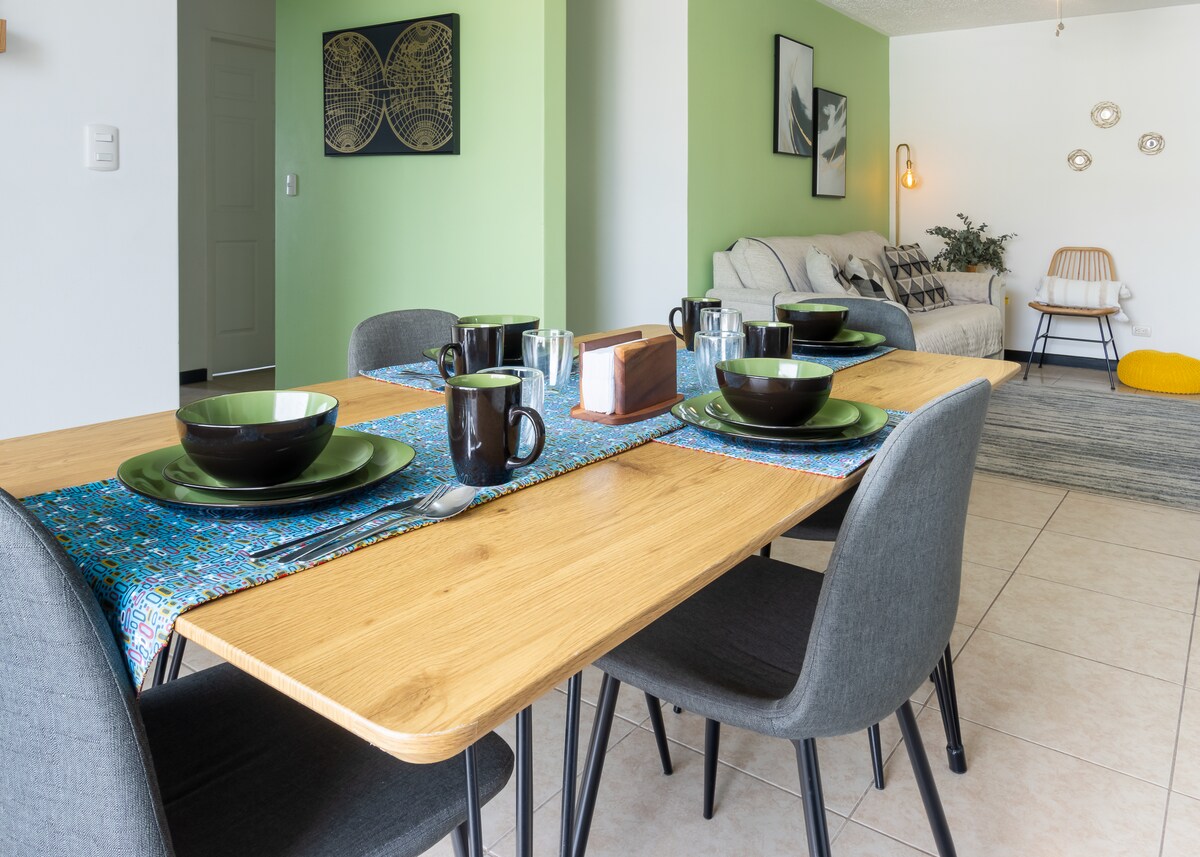 Relax with the whole family in this peaceful place to stay. 3 bedroom apartment in a housing complex with trails, lake, swimming pools, full of green areas, beautiful views. With an excellent location very close to the main highway of Costa Rica ("27"), just 10 minutes from Juan Santamaría Airport.