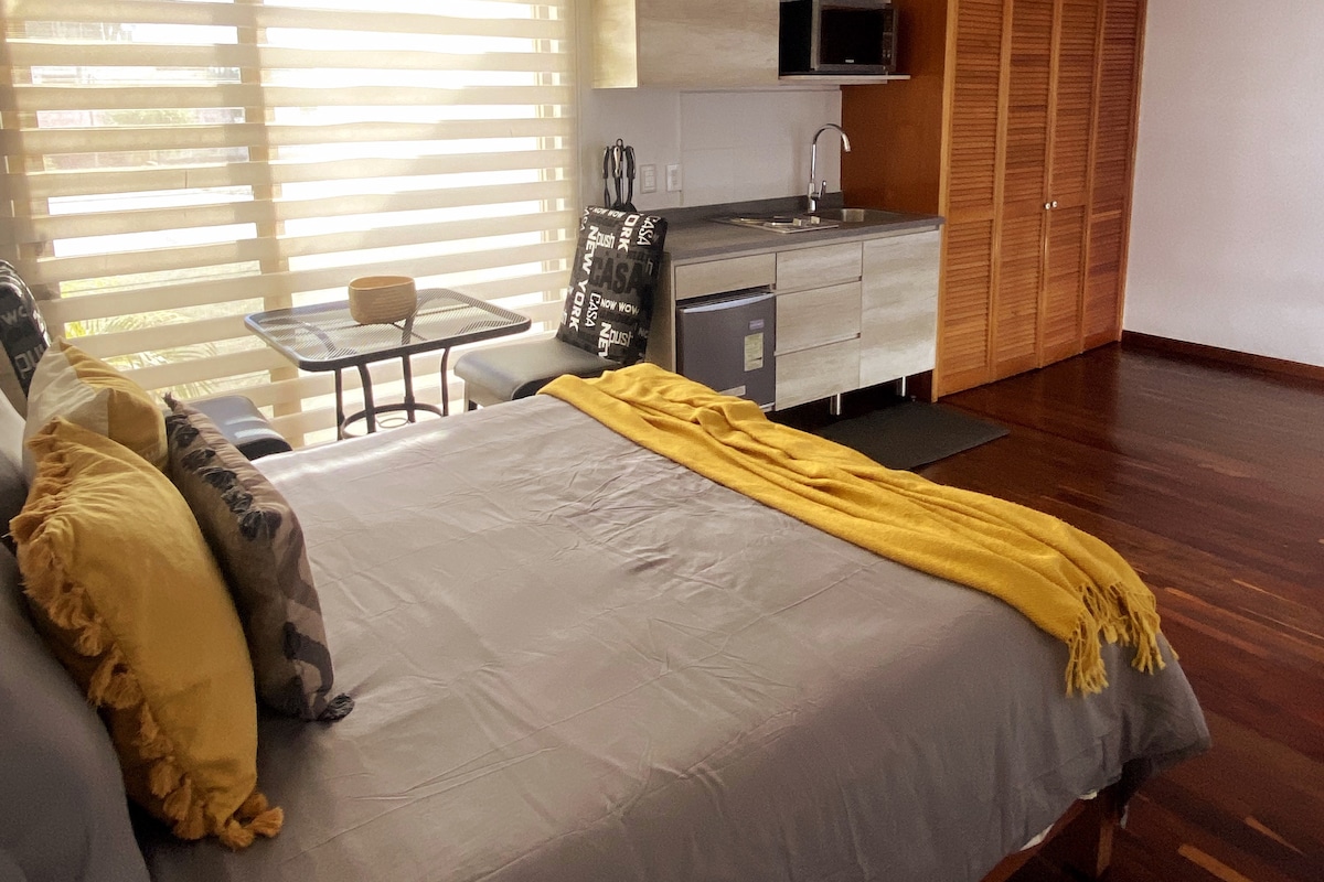 - Acogedor y exclusivo estudio ejecutivo con cama queen-size, escritorio y aire acondicionado. - Balcón para tomar aire fresco. - Cocina equipada. - Ingreso con cerradura inteligente y clave personalizada y exclusiva para cada huésped. - Rooftop panorámico con restaurante en el nivel 9. - Sala de juntas equipada para reuniones profesionales (consultar disponibilidad). - Acceso 24/7 con código personalizado. IMPORTANTE: No contamos con estacionamiento privado dentro de la propiedad.