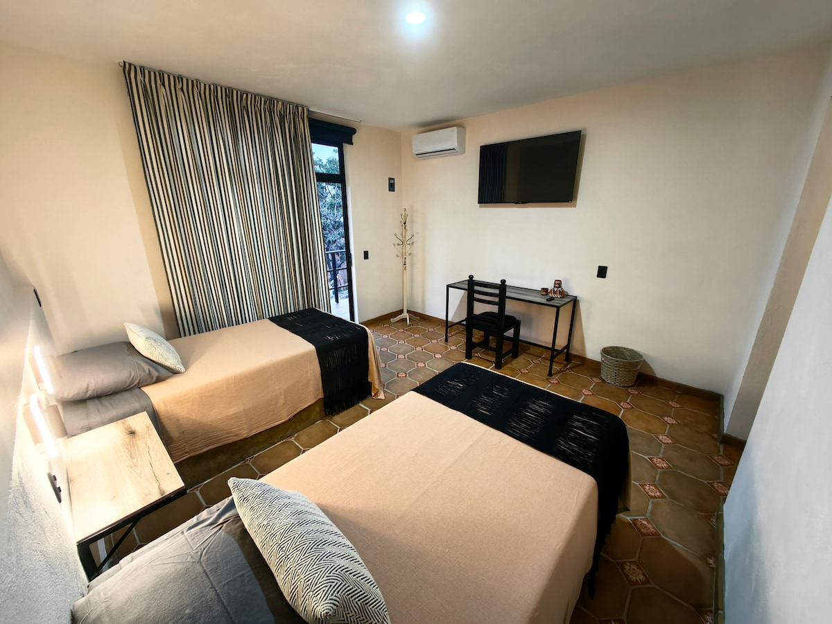 Amplia habitación de una cama queen size con una individual, excelente para descansar y preparar una deliciosa taza de café, cuenta con los utensilios básicos de la cocina, para que puedas preparar tus alimentos, cuenta con dos televisiones ambas con cable e Internet red Wifi de alta velocidad.