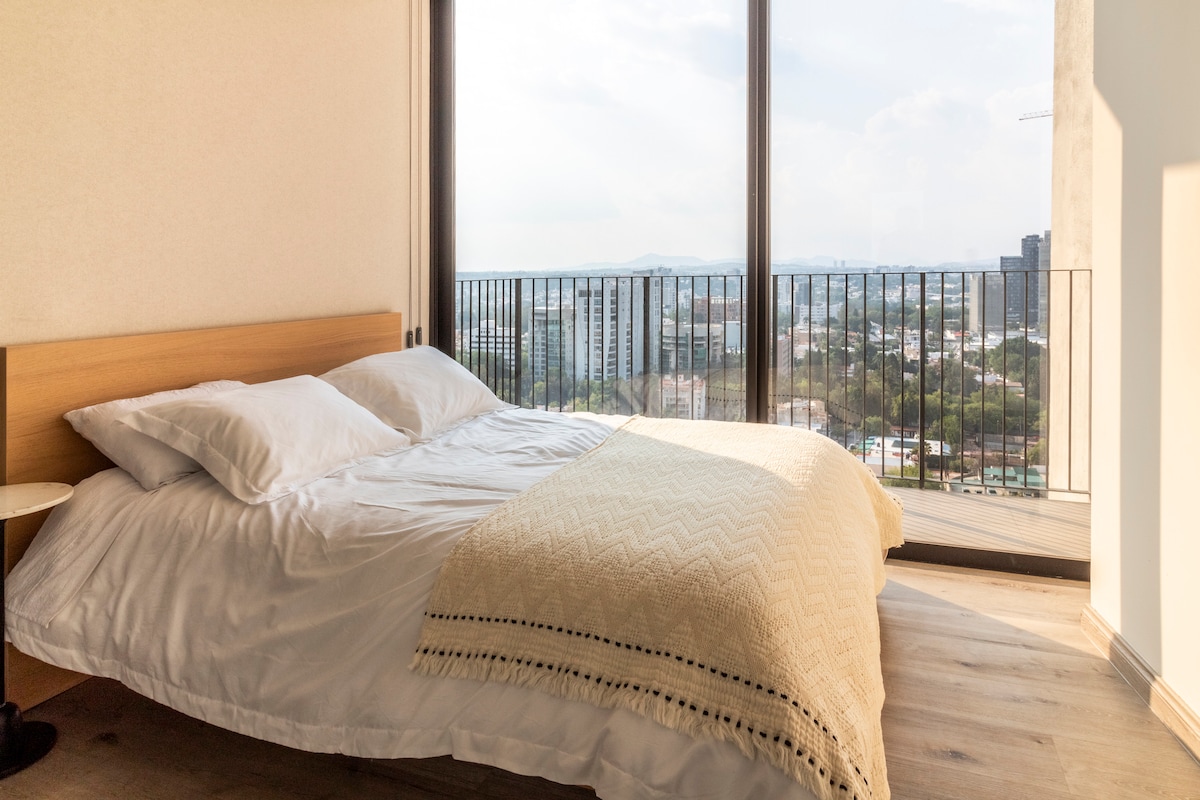 Loft en piso 19 con vista panorámica! Equipado con Aire Acondicionado, Lavasecadora, freidora e internet de alta velocidad. Mobiliario de calidad, confortable y acogedor. Estacionamiento techado y seguridad 24 Ubicado en la zona más cool de Guadalajara donde podrás para moverte a pie, bicicleta, transporte público o auto; cerca de restaurantes, bares, Expo, plazas, parques, bosques, centro de la ciudad. Cuidamos la higiene, desinfectando entre cada huésped, brindando un espacio limpio y seguro