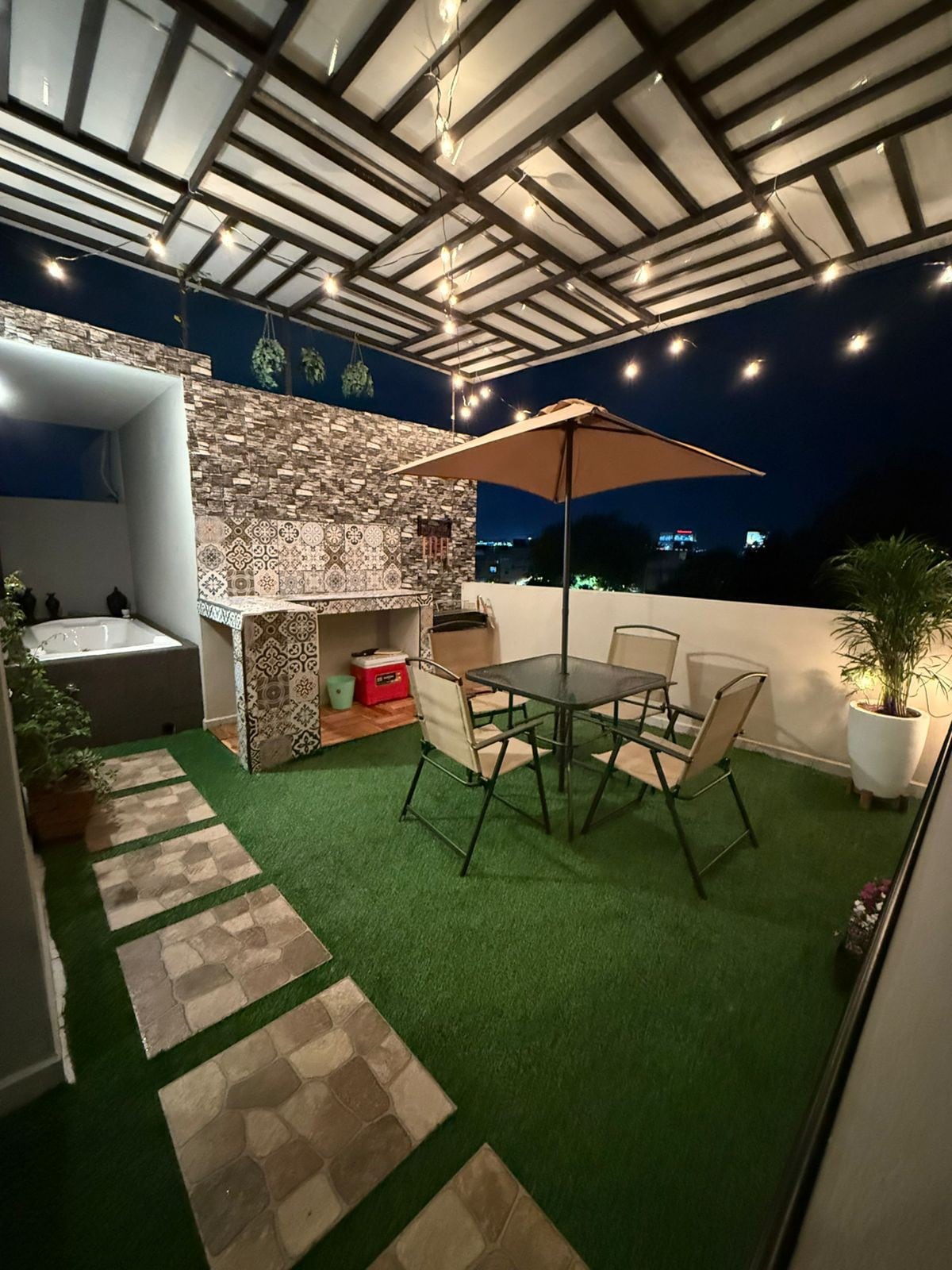 Departamento elegante y céntrico que ofrece un espacio único y cómodo para los viajeros que buscan una inolvidable estadía. El depa se encuentra en el corazón de Guadalajara, zona chapultepec/americana, ofreciendo un fácil acceso a las atracciones más populares de la ciudad, incluidos lugares de interés histórico, la mejor zona gastronómica y cultural (cafeterías, mercados, bares, etc). Disfrutarás de una vista de 360° desde nuestra terraza rooftop. Contamos con 2 terrazas, alberca y firepit.
