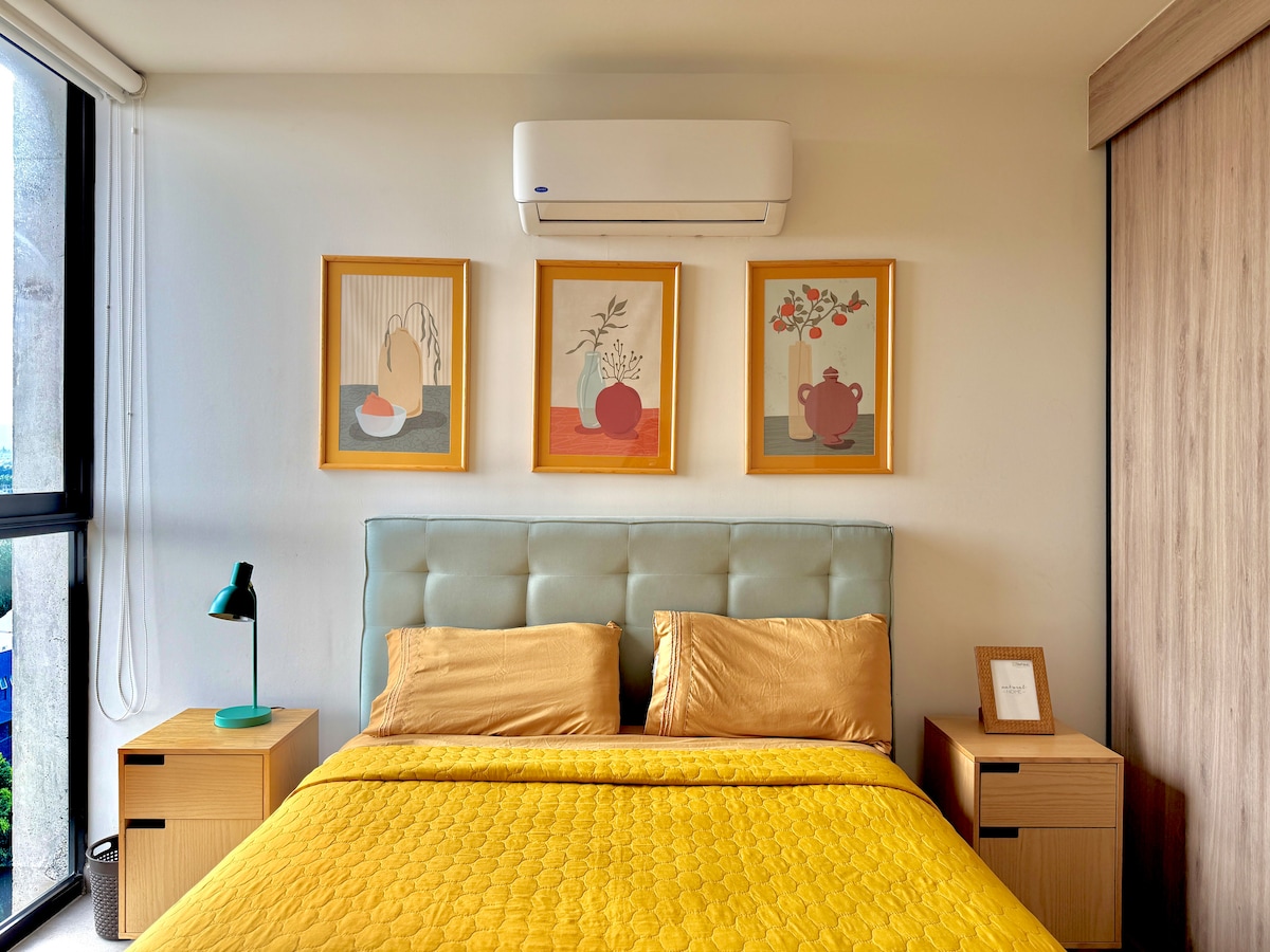 El departamento cuenta con aire acondicionado en RECÁMARA PRINCIPAL. El servicio se contrata por separado. Costo adicional de $99.00 pesos por día. Relájate en este espacio tan tranquilo y elegante. Totalmente nuevo con dos habitaciones. Espacioso para 4 huéspedes. Con opción para un 5to [con costo extra]. Con amenidades [gimnasio, ludoteca, espacio de trabajo, cine]. Excelente ubicación. En el sur de la ciudad. A 5 minutos de la plazas y supermercados. Haremos que tu estancia sea placentera.