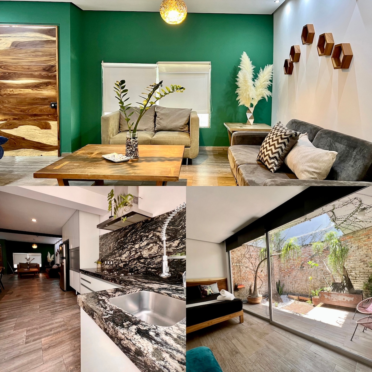 Departamento nuevo y privado en primer piso dentro de una casona remodelada, con cama King, sofá cama, sala, comedor y cocina completa. Ideal para parejas o amigos. Elegimos una hermosa casa cuya arquitectura nos enamoró inmediatamente por sus muros altos de piedra y ladrillo, sus enormes ventanales en una calle tranquila y segura, en la zona más turística, bares, cafecitos, restaurantes trendy. Internet rápido de alta velocidad hasta 350 Mb La mejor ubicación de Guadalajara, Col.Americana.