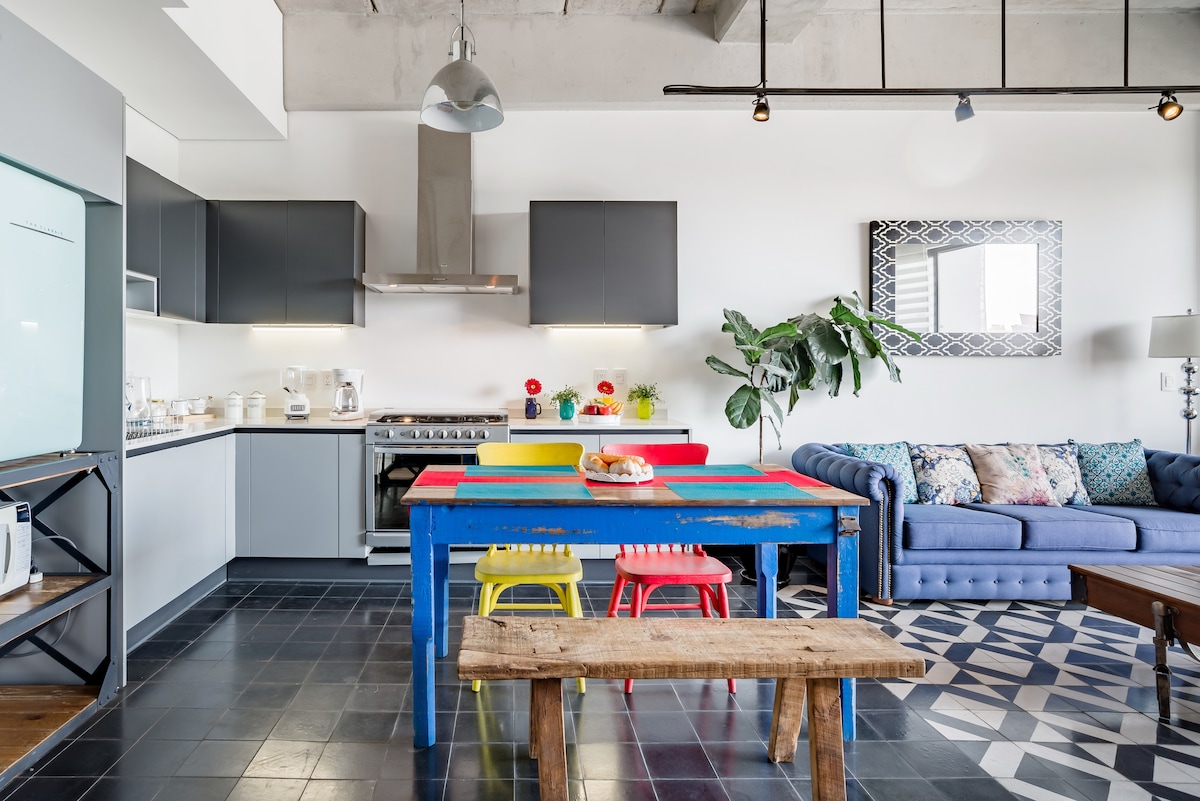 Juega al futbolito e inspírate del arte que llena las paredes de este loft de estilo contemporáneo. El hormigón le pone el sello a este departamento y se combina a la perfección con mosaicos y muebles. Es cómodo e ideal para recorrer la ciudad a pie. Tiene una terraza desde la que se aprecia maravillosa vista de la zona. El edificio tienen cámaras de vigilancia y seguridad en la entrada, puedes estar tranquilo al salir a conocer