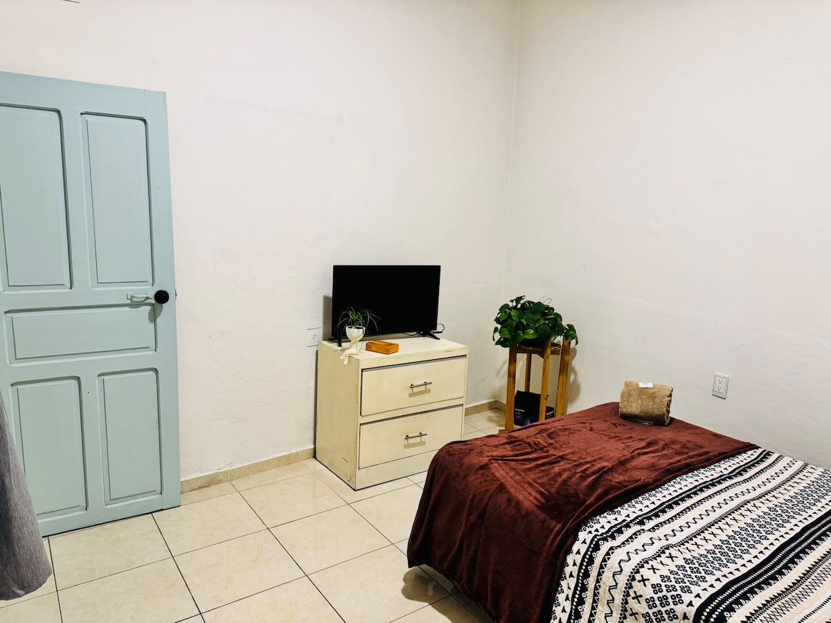 Este espacio, es excelente para estancias largas o cortas, cuenta con todo lo necesario para tu comodidad, cocina equipada, bien iluminado, son dos recamaras, en una se encuentra la cocina, estudio y televisión, tiene un balcón lleno de plantas, con una hamaca super cómoda para la siesta, un pequeño comedor. En esta recamara contamos con un futon que se hace cama matrimonial. La segunda recamara tiene unos sillones y la cama principal que es también matrimonial.