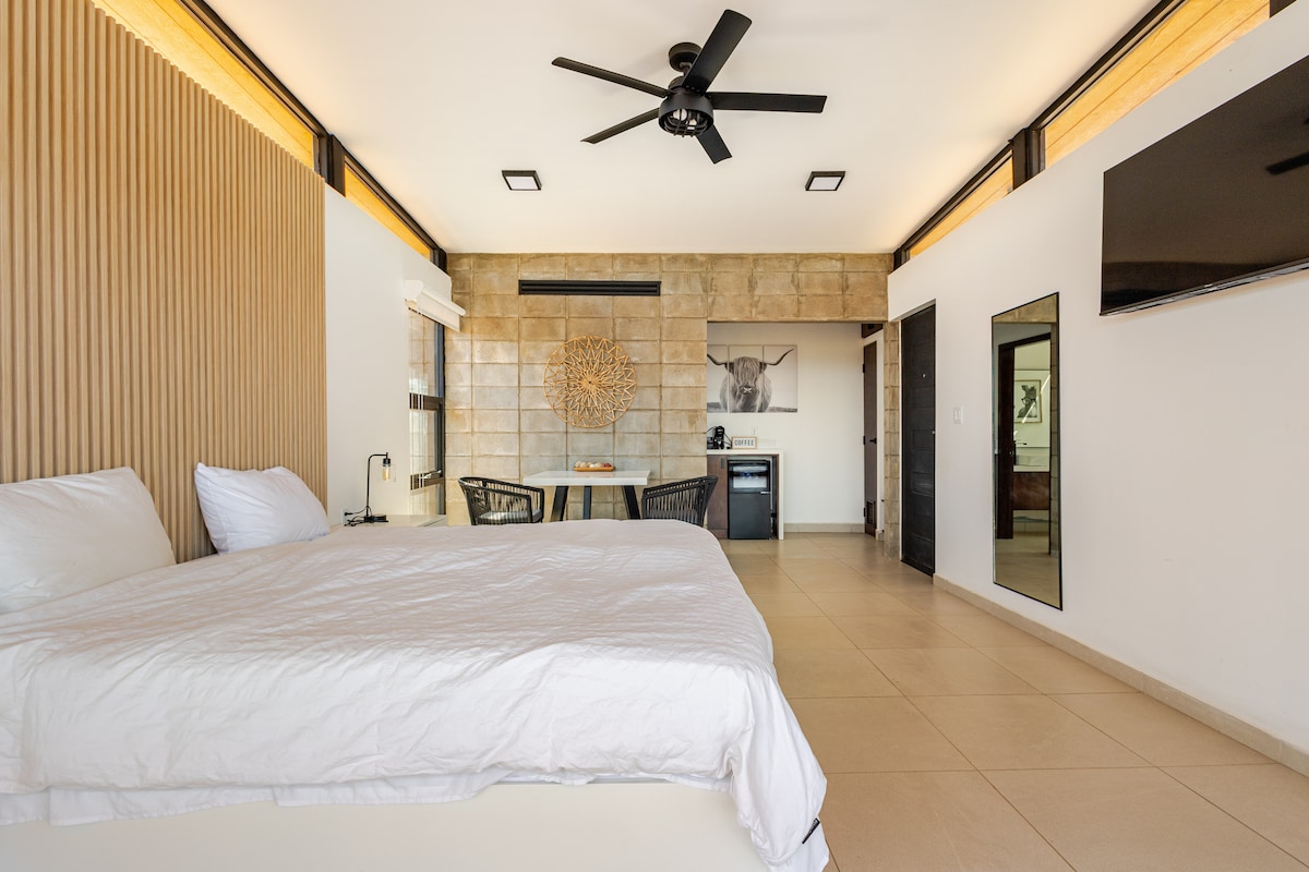 Room designed for a pleasant rest and to enjoy sunrises, sunsets, the sky, stars, and the moon from your terrace. Suitable for two people, with a Queen bed, air conditioning, fan, coffee maker, hot water, and high-speed satellite internet. Perimeter wall for privacy and security. The bathroom has a mirror, soap, shampoo, conditioner, hand towel, and hairdryer. Enjoy vineyards and wineries in Valle de Guadalupe. Safe and close to the region's most iconic places.