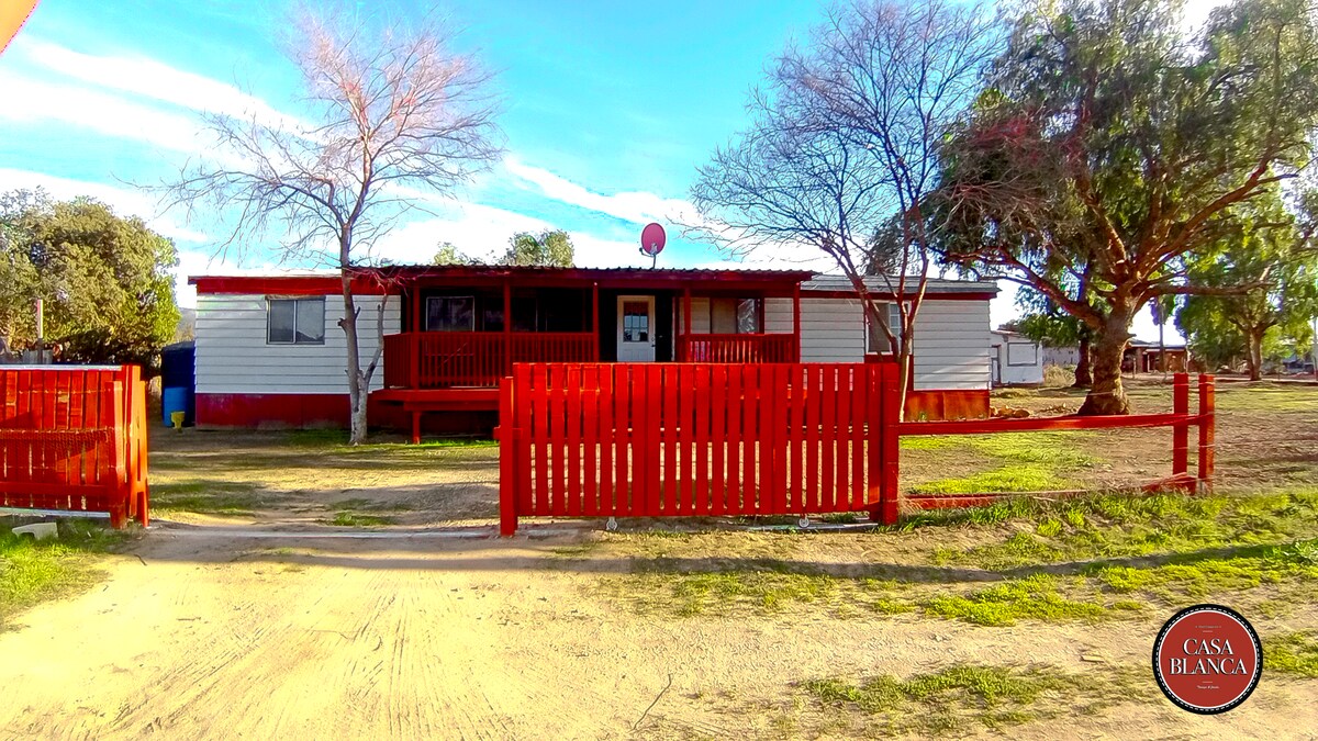 Casa completamente nueva con ubicación ideal con fácil acceso sobre la carretera principal en el centro del Ejido el porvenir a pocos minutos de las principales vinícolas, restaurantes, tiendas y oxxo a 2 minutos en carro, una casa pet friendly, privada, tranquila y espaciosa, recomendada para familias o grupos. En medio de un viñedo familiar de 20 hectáreas y olivos de más de 85 años todo en un solo lugar ya que cuenta con servicio adicional de degustaciones de vinos y aceite de oliva.