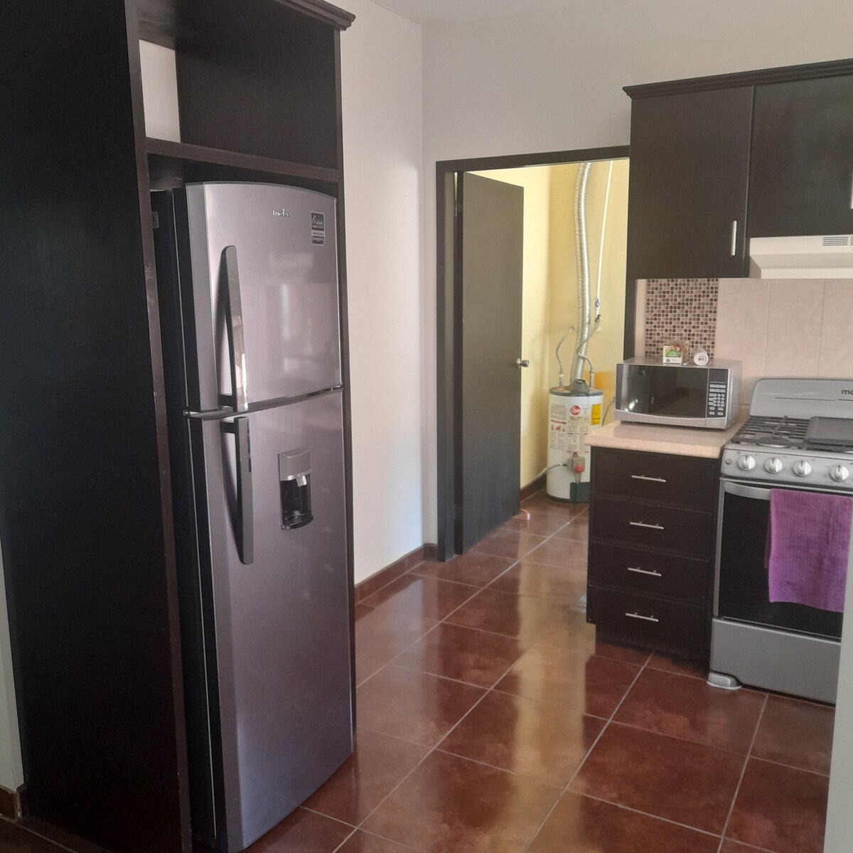 It is a nice apartment with one big bedroom king size bed and a complete restroom upstairs, down stairs there is a living room with a folding bed coach for another 2 persons, it has a kitchen with refri , stove, dishes , coffe maker,micro and it has another complete restroom, Outside there is a big patio with outdoor furniture and a nice jacuzzi with hot water and jets to have a very peaceful time, it has another complete restroom outside and you can put your car inside the property.