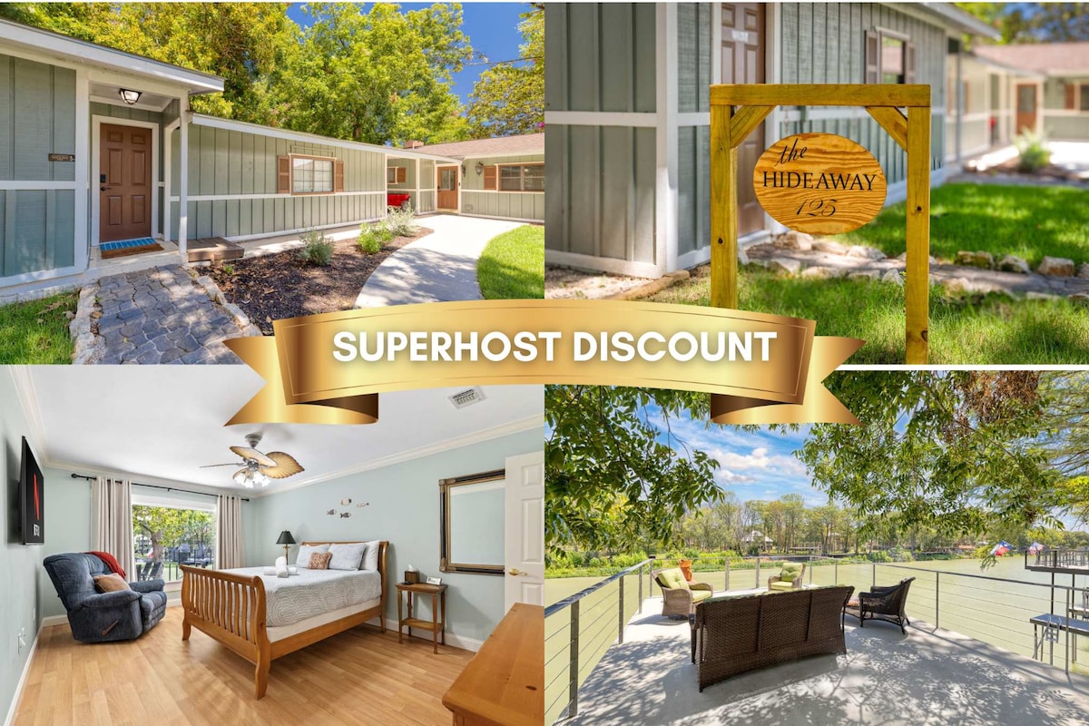 LAKE NOLTE RETREAT hosted by CTXBNB: Serene perch under the trees on the banks of the Guadalupe River in Seguin, TX. One-bedroom, riverfront tiny home with sleeping loft. Plenty of outdoor space. Relaxing views from two-level dock. FREE kayaks. Great fishing. Reconnect w/ great outdoors: fire pit, loungers, hammock chairs under a canopy of trees. Sleeps 5 ($25/night surcharge for 5th guest).