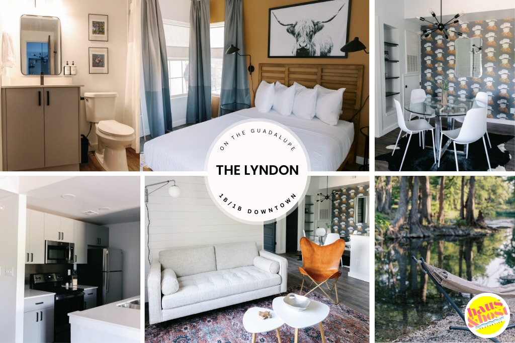 Welcome to The Lyndon, a charming 1-bedroom, 1-bath retreat along the Guadalupe River in downtown New Braunfels. Inspired by Texas Hill Country culture, this second-floor escape blends mid-century furnishings with retro ranch flair—creating a space that’s effortlessly Texas-chic. Enjoy your morning coffee or evening cocktail on the private balcony for a true Lone Star vibe. Please note: This unit is in Building Two, with a balcony facing the parking lot, located on the second floor.