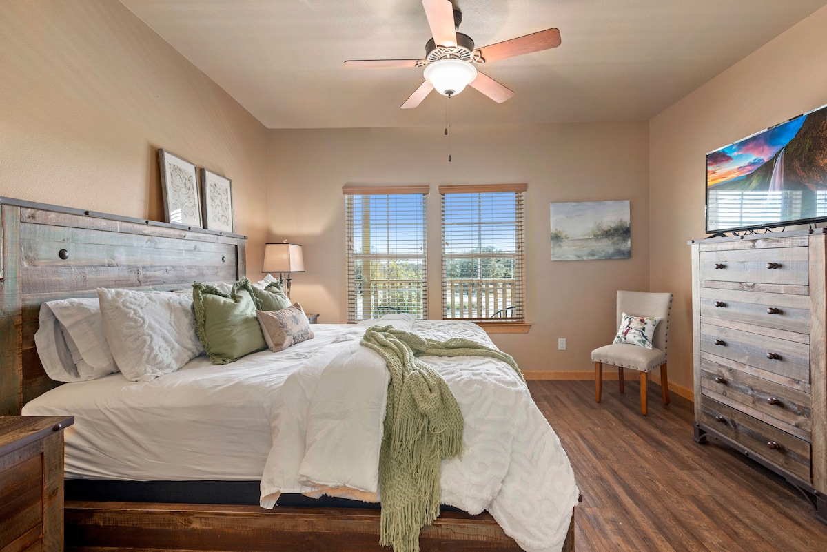 This 2nd floor renovated 1,307 sq ft T-Bar-M condo is perfect for smaller groups who love family friendly activities. The complex has private tennis courts for guest use, beautiful pools, and a private entrance. Guests will get a wonderful night's rest on our comfortable mattresses and luxurious linens after tubing the Comal or Guadalupe Rivers or splashing around at the Schlitterbahn Water Park. The large, completely renovated open concept kitchen/living area are perfect for relaxing.