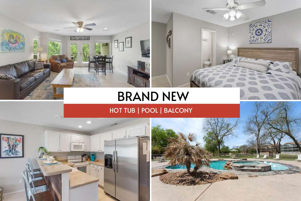 *AVAILABLE FOR WINTER TEXANS & SPRING BREAK! Super clean and updated private entire condo. 75", 50", 40" HDTV, Wi-Fi, Netflix, Cable TV, smart lock. 4 hot tubs, 2 pools - one pool heated year round, private river access. Close to everything! Comal Tube Shoot, New Braunfels square, Schlitterbahn, Gruene Hall, Gristmill, Krause's Biergarten, Neagelin's Bakery, Rockin' R Tubing, Wurstfest, Landa Park, and more **Formerly Mr. Wright's Condo (4.98 Starts with over 100 reviews) under new owners.