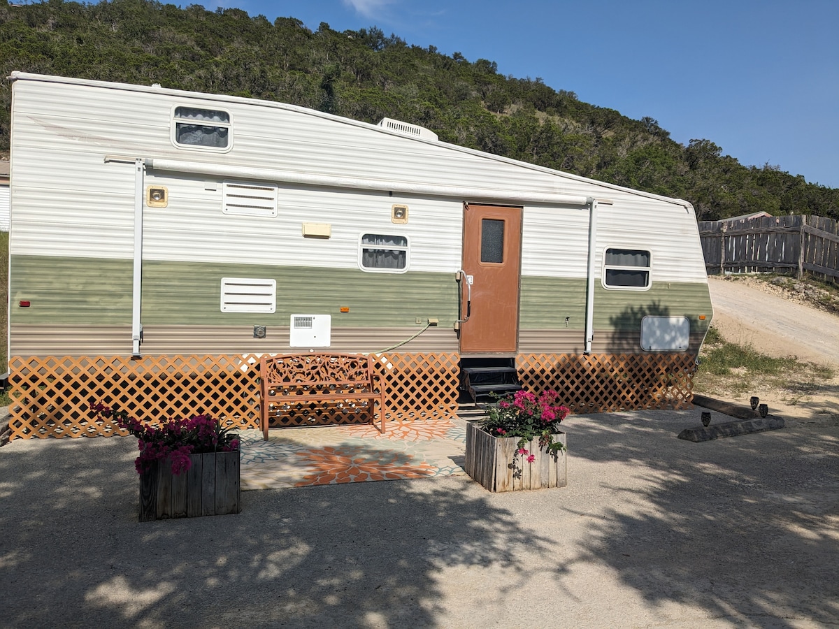This 40 ft RV is nestled in a natural surrounding at the top of a hill near the Guadalupe River which makes for the perfect glamping getaway. It has that adventurous outdoor feeling of getting away from it all but with all the comforts of home. All within 1 mile of Historic downtown Gruene and 3 miles to Schlitterbahn water park and downtown New Braunfels. Package includes use of tubes and kayaks. Comal County WORD Permit #L1494