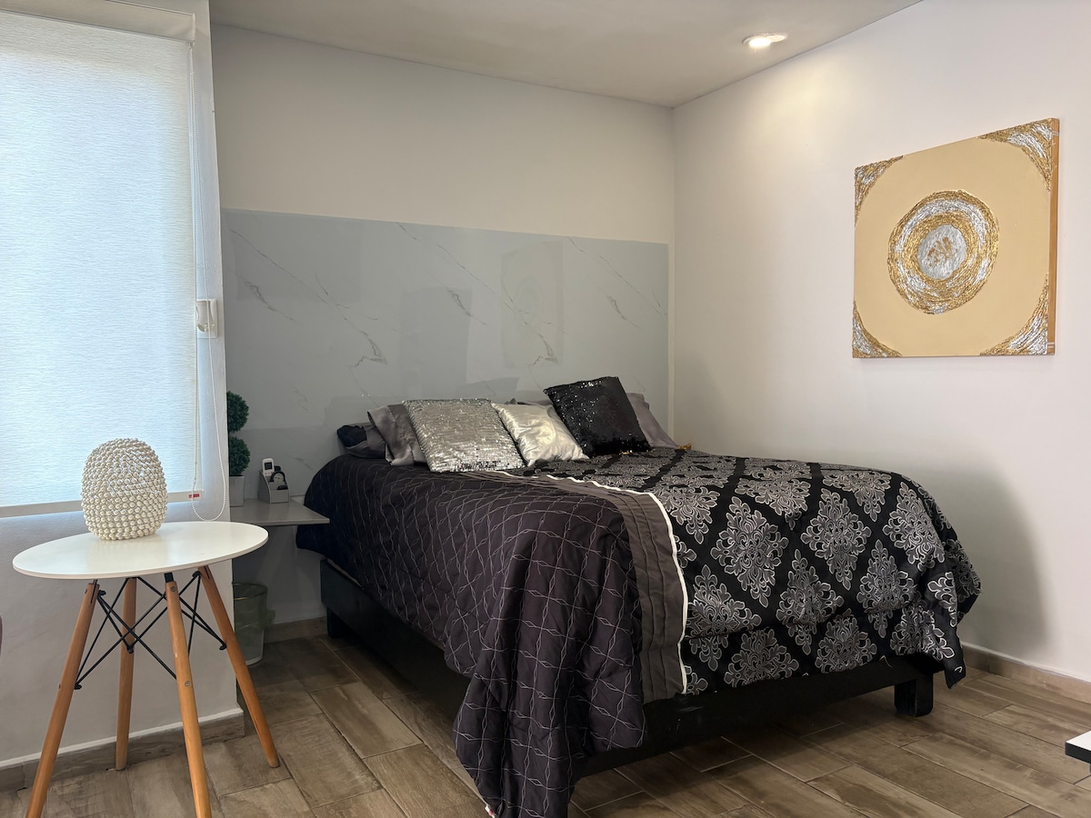 Acogedor Departamento tipo Studio en el sur de Monterrey Ambiente privado con entrada independiente y cochera privada. Un espacio cómodo, limpio y abierto con internet, cocina, área de trabajo, baño completo, Aire Acondicionado. etc. Excelente ubicación cerca de: Tec, Fundidora, Cintermex, estadio BBVA, Novo Sur, Plaza California, Centro, San Pedro, restaurantes, supermercados, cines, farmacias, casas de cambio 1 cuadra OXXO, BBVA, Banorte 2 cuadras de Starbucks 3 cuadras de L. C. Pizza