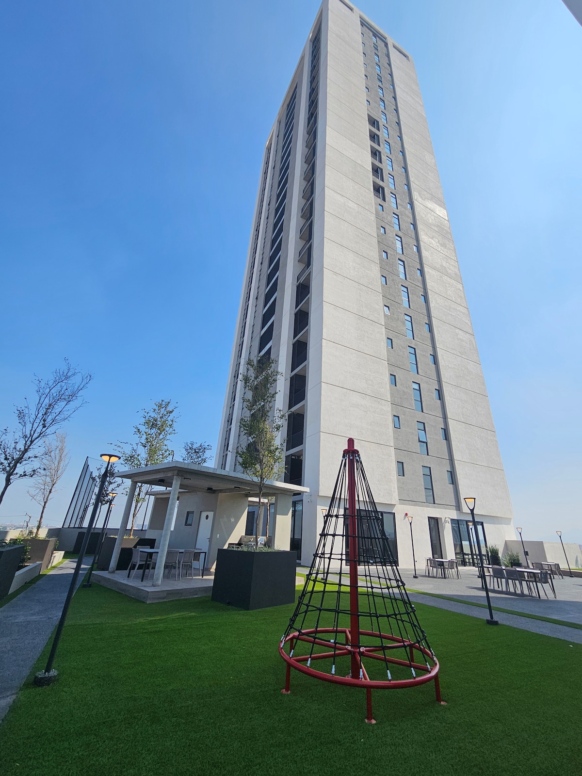 Disfruta de este alojamiento tranquilo y céntrico departamento , con seguridad 24 7 , cerca del área de medicina, y hospitales en Monterrey, piso 23, terrazas con asadores, sala de karaoke, sala de juegos y mas amplias con vistas de la ciudad, Gym, Cowork, Tv de 55 pulgadas, wifi de alta velocidad. ideal para viajes de negocios o placer, cuenta con cama Queen , Sofá Cama, Cocina integral, mucha luz, cajón de estacionamiento techado.