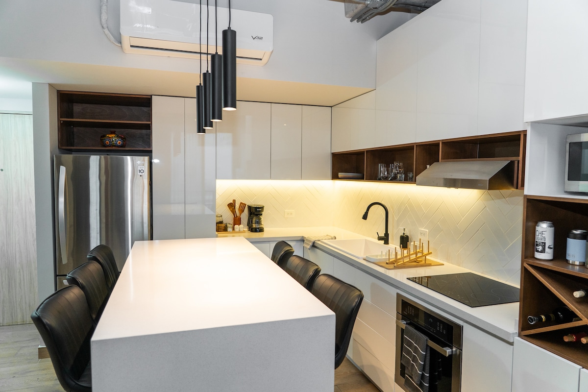 Hermoso LOFT con cama King Size en el centro de Monterrey en Barrio Antiguo. Super comodo para turistear, visita de negocios, o tramites en el CAS Monterrey. Edificio céntrico y seguro con excelentes vistas y amenidades de primer nivel como zona de coworking, gimnasio, alberca en piso 30 con vista al cerro de la silla privilegiada, sala de cine, asadores, salon de juegos. • WiFi de alta velocidad. • Pantalla Smart OLED de 75". • Escritorio de trabajo. • Cocina 100% Equipada.