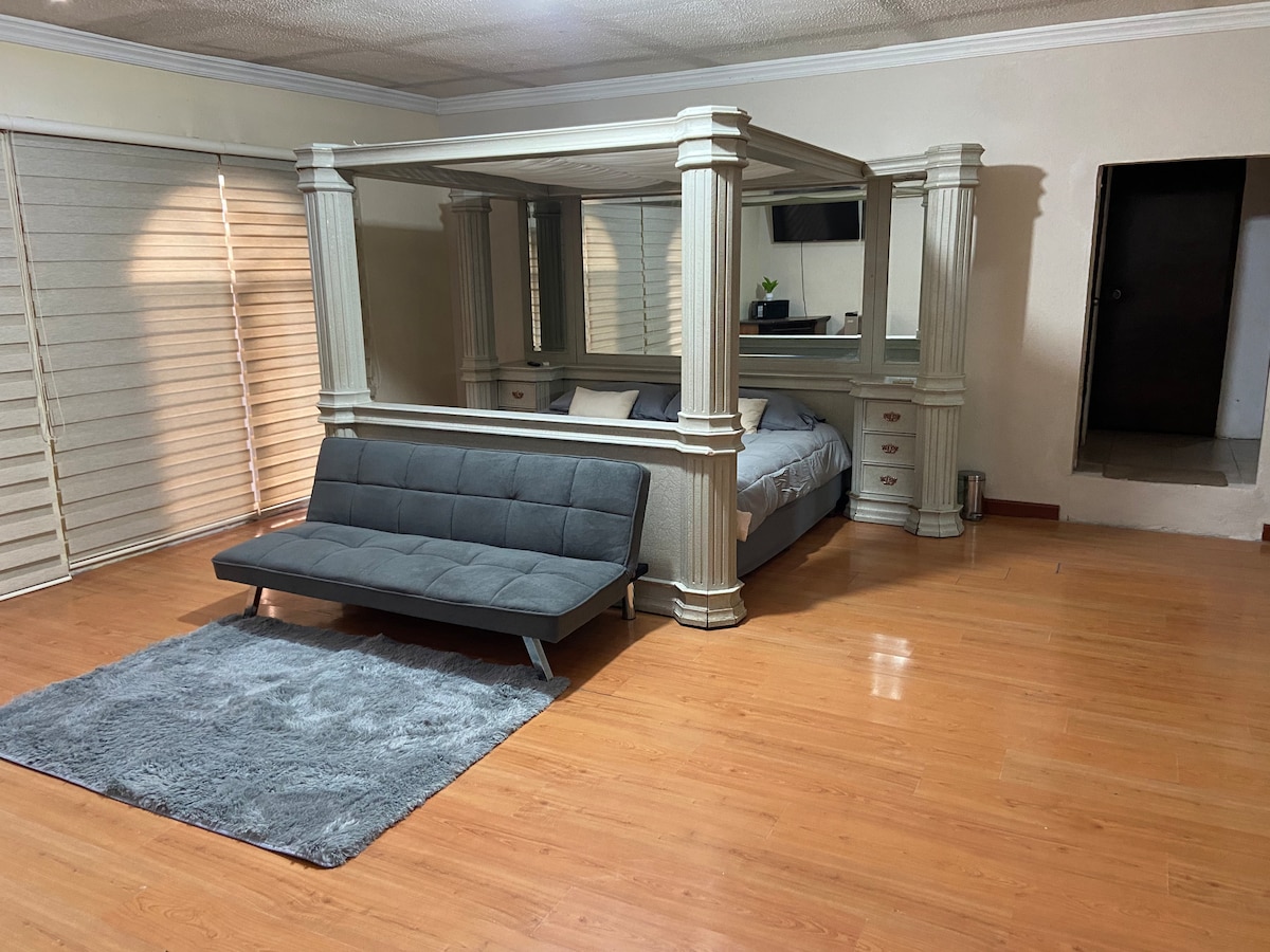 Tu familia estará cerca de todo si te hospedas en este alojamiento céntrico. Cómoda habitación en casa, cuenta con cama Kingsize, colchón y colchoneta memory foam. Cuenta con lámpara de noche, peinador y espejo, closet y cajones. Baño privado al interior del alojamiento con agua caliente. El espacio está disponible todos los días.