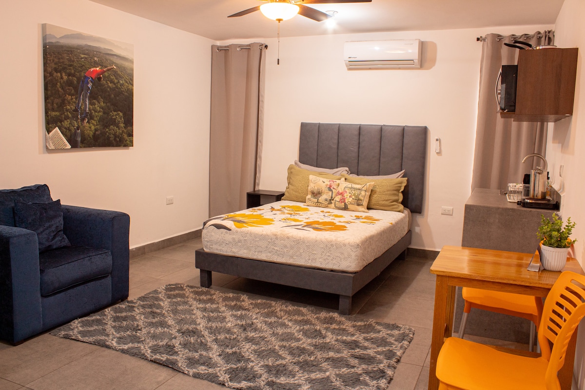 Acogedor Departamento tipo Studio en el sur de Monterrey Ambiente privado con entrada independiente y cochera privada. Un espacio cómodo, limpio y abierto con internet, cocina, área de trabajo, baño completo, Aire Acondicionado. etc. Excelente ubicación cerca de: Tec, Fundidora, Cintermex, estadio BBVA, Novo Sur, Plaza California, Centro, San Pedro, restaurantes, supermercados, cines, farmacias, casas de cambio 1 cuadra OXXO, BBVA, Banorte 2 cuadras de Starbucks 3 cuadras de L. C. Pizza