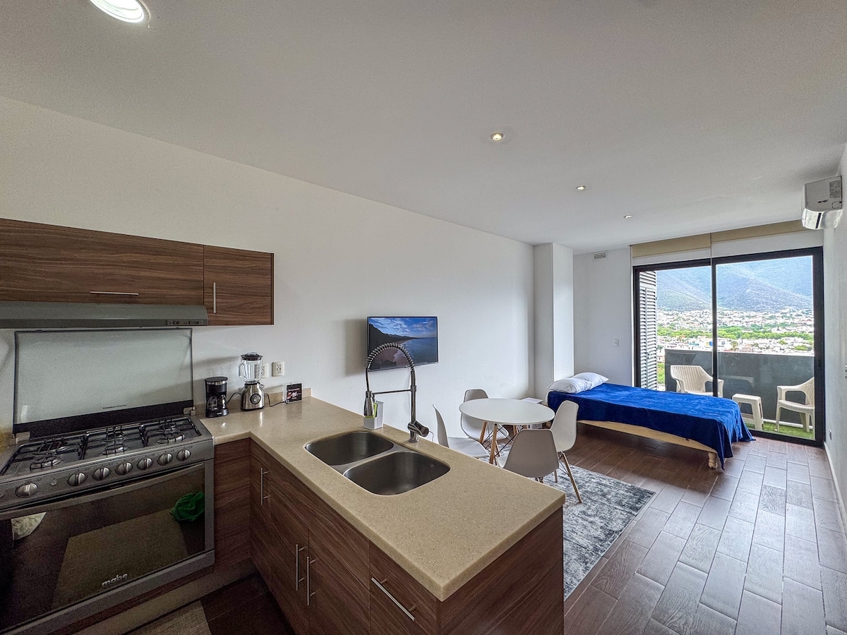 FACTURAMOS - Agua 24/7 - 3 personas ¡Bienvenido a Puntacero! Esperamos recibirte en uno de nuestros Airbnb más lujosos de Monterrey. Departamento con acabado excepcional y vista al cerro de la silla. ¡Ubicación única! Wifi, Smart TV, climatizado, 1 cajón de estacionamiento. Ideal para ejecutivos, familias y turistas. Seguridad 24/7, 3 elevadores, EXCELENTES AMENIDADES. Plaza comercial con restaurantes y un OXXO cerca. Cama King y Sofá cama Matrimonial.