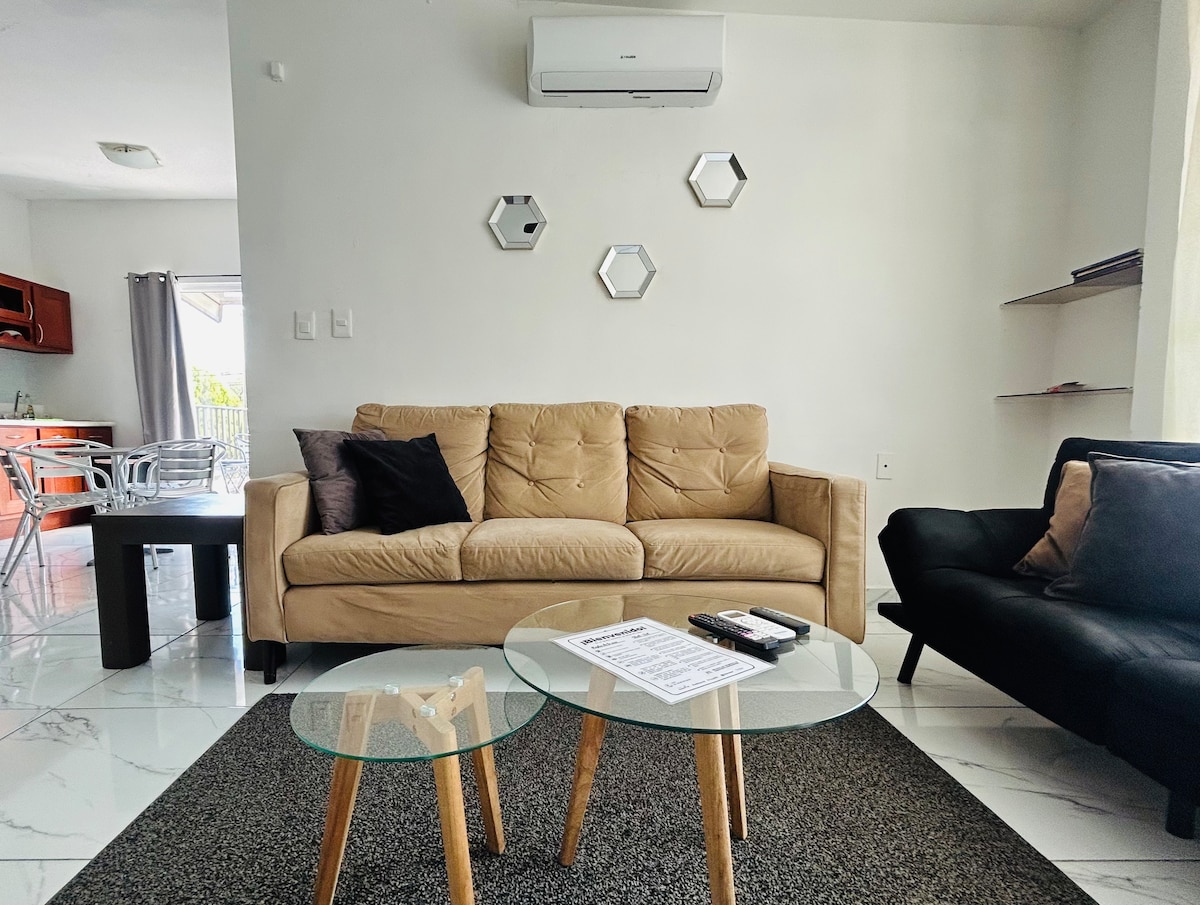 Departamento entero, en recámara tiene cama King Size y 2 sofá cama, aire acondicionado frio/calor, TV, closet y cajoneras. Además, tiene exclusivamente para ti: sala con 2 sofá cama, baño completo, barra comedor, cocina (con refri, estufa, micro ondas, horno, cafetera, nutribullet, sartenes, platos, etc.) Wi-fi rápido de 80MB, TV en sala.