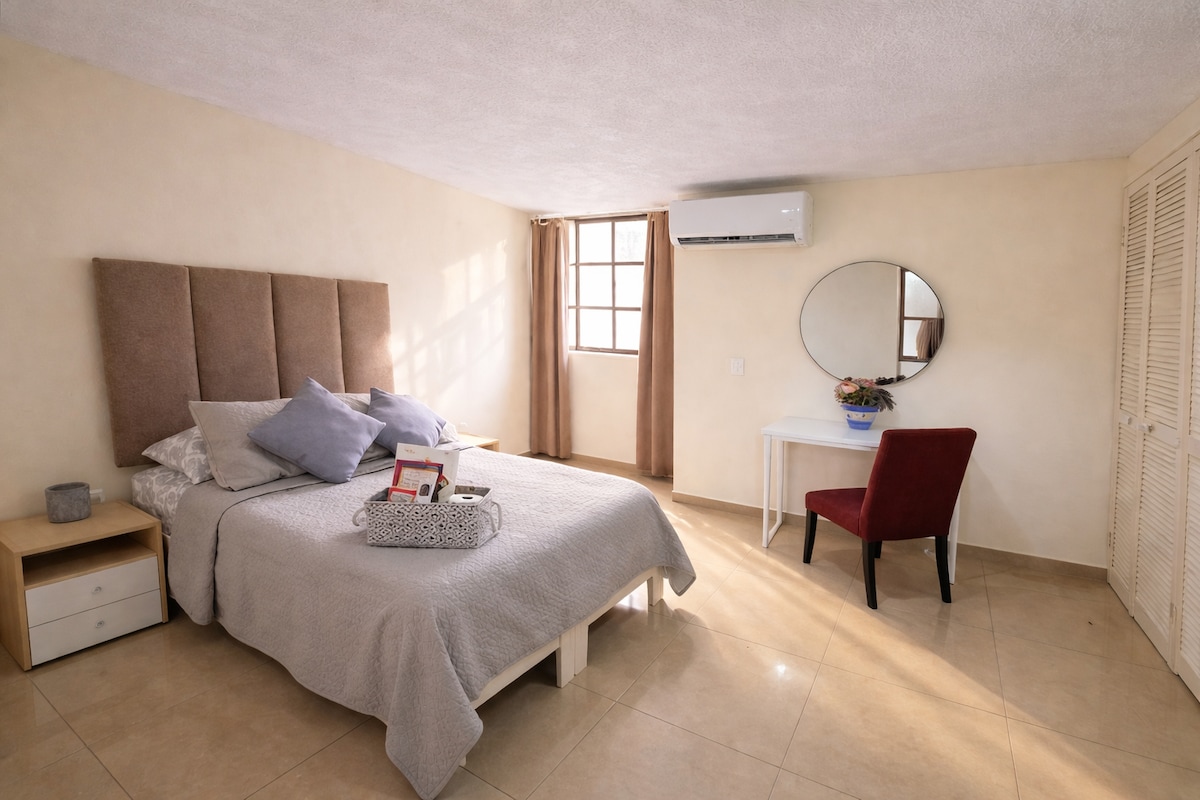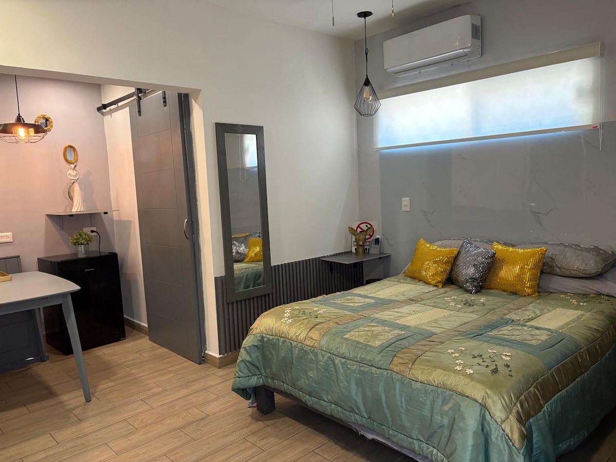 Moderno loft , cómodo con entrada independiente , cajita con clave. Tranquilo. Wifi. Tele con smart Tv. Agua caliente fría. Microondas. Cama Quin size lugar tranquilo con mesa y lugar para sentarse. Minisplit. Refrigerador. Microondas. Abanico toallas. Jabones de cuerpo shampoo y de manos.licuadora secadora de pelo plancha y tabla para planchar.cuenta con pequeña cocineta. Microondas. Tostador. Licuadora. Parrilla. Platos vasos y tarja para lavar trastes.frigo bar. Secadora de pelo.