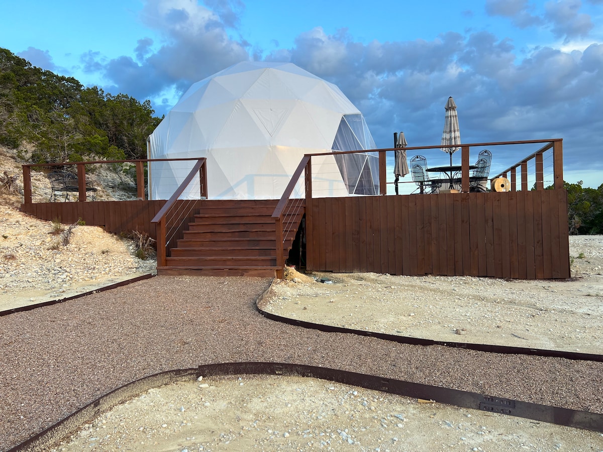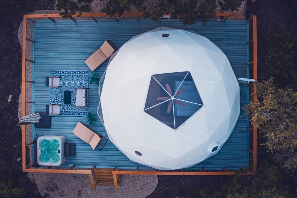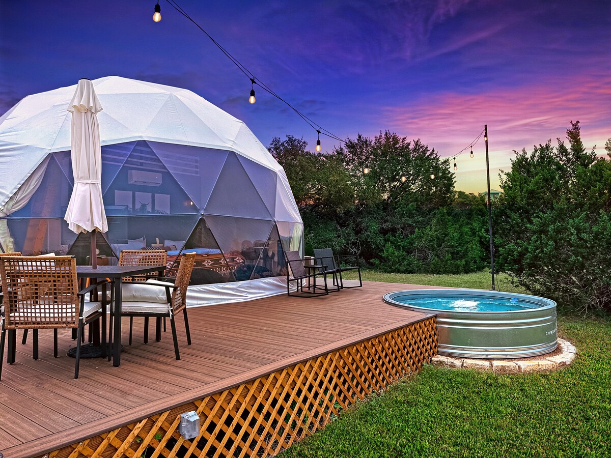 Come and enjoy amazing views while glamping in the Hill Country of Texas! The Hill Country Dome is set on 11 acres of peace, quiet, and privacy. Enjoy a spacious deck with a hot tub, table and chairs, and grill. Just steps away enjoy the sunset at your own private fire