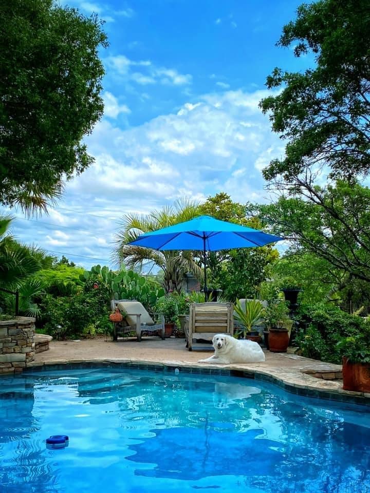 Large Queen bed Suite, Private entrance, Private bath, beautiful pool overlooking the gorgeous hill country. Fridge/Freezer, microwave and coffeemaker in room, high speed fiber WIFI, Roku LED TV with Hulu, Netflix . *Clothing optional resort style property* I have a very friendly Pyrenese Mix that spends various times in the yard. I keep her in the dog run part of the time. If you do not like dogs this probably would not work for you as you will have some contact with her.