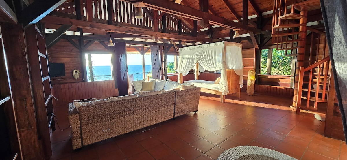 Maison , vue 180° sur mer des Caraïbes. Plage a 50 mètres. Cuisine toute équipée (plaque, micro-ondes, lave vaisselle, lave linge etc...), air conditionné dans les chambres, grande véranda de 50m2. Bar ouvert sur véranda. Deck avec solarium et barbecue. Chambres spacieuses avec rangements. 2 salles de bains, 2 WC. Salon et espace repas sur véranda. Wifi gratuit (fibre) Proximité route passante occasionnant en journée du bruit de voitures . Cet inconvénient disparaissant le soir et la nuit.