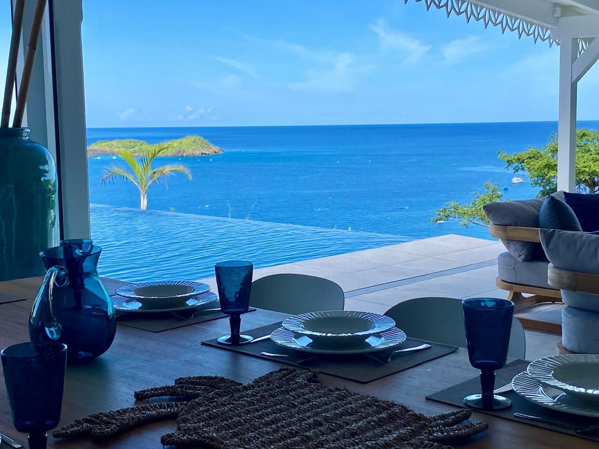 Nestled on a natural vantage point overlooking the Caribbean Sea, the Villa 'Blue Haven 1' is one of four exceptional villas offered by *Blue Haven Villas Guadeloupe*. Sleeps 4. Three beds, perfect for a couple or small family - Private salt-water infinity pool. - Mosquito nets on the windows and beds. - 180° seaview and seafront access to one of the most beautiful snorkeling spots, seafront hammocks, sunbed - Dish & clothes washer, Nespresso machine - Parking, a-c, BBQ, Wi-Fi - snorkelling gear