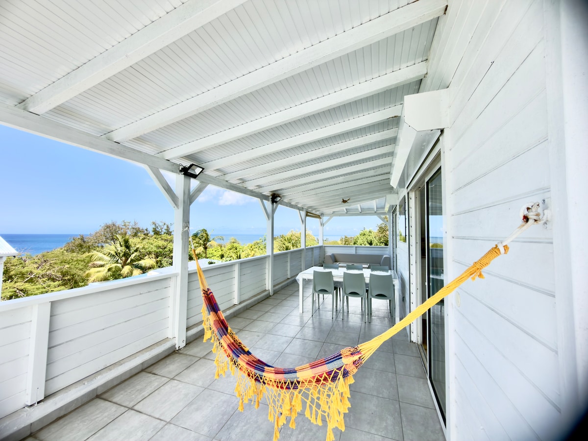Maison , vue 180° sur mer des Caraïbes. Plage a 50 mètres. Cuisine toute équipée (plaque, micro-ondes, lave vaisselle, lave linge etc...), air conditionné dans les chambres, grande véranda de 50m2. Bar ouvert sur véranda. Deck avec solarium et barbecue. Chambres spacieuses avec rangements. 2 salles de bains, 2 WC. Salon et espace repas sur véranda. Wifi gratuit (fibre) Proximité route passante occasionnant en journée du bruit de voitures . Cet inconvénient disparaissant le soir et la nuit.