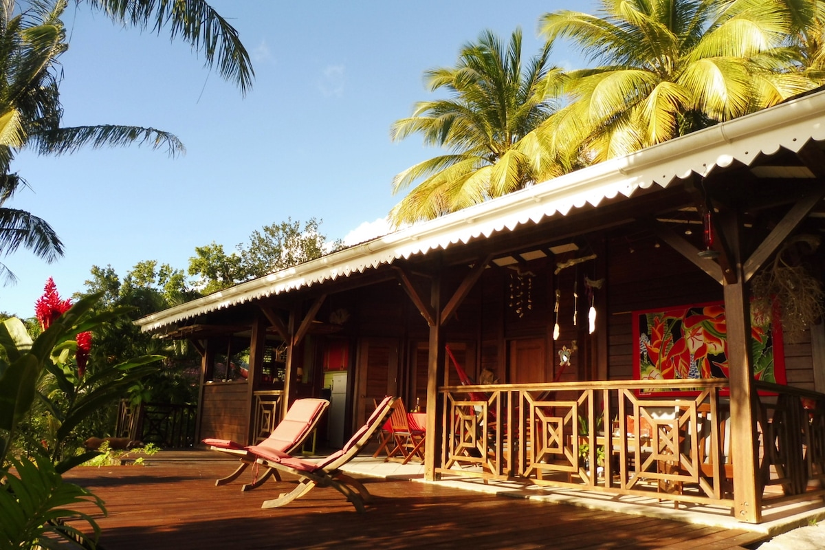 Gwo-Roch , le bungalow ( 4 pers. max. ) se trouve sur les hauts de Pointe-Noire & Acomat. Ce grand chalet de 62m2 faisant partie du Domaine "Acomat-Bellevue" dispose d'une vue à couper le souffle, d'une situation calme qui invite au repos et la découverte d'une nature encore préservée. Niché à 200m d'altitude le climat y est idéal Laissez vous bercer par les Alizés à Acomat-Bellevue, un lieu unique pour se ressources en couple, en famille ou entre amis ! Bienvenue au paradis !