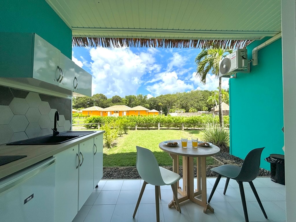 Face à la piscine, confortable et charmante, la suite Junior Soleil vous accueille à 2, 3 ou 4 personnes. Elle accueille un lit Queen size à baldaquin, un canapé convertible très confortable, des rangements et un téléviseur. Coté terrasse, l'espace repas et la kitchenette permettent de rester autonome mais le service petit déjeuner et dîner sont également possibles côté restaurant. Son patio vous séduira pour le farniente dans le hamac ou les chaises longues.