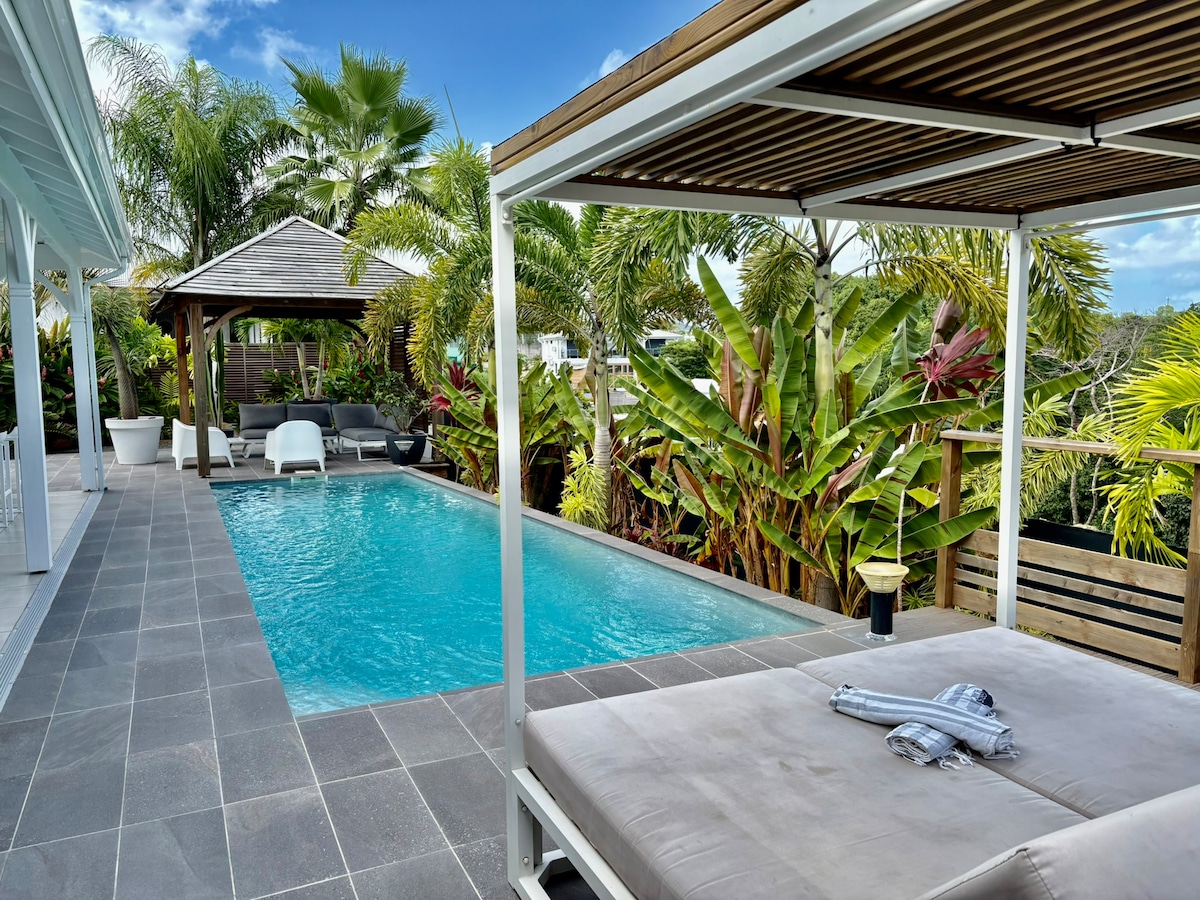 Idéalement situé entre St François et St Anne (Anse à la Barque), ce meublé de tourisme classé 4 étoiles se situe à 10 mn à pied de la plage, 5 mn des commerces en voiture, 10 mn du Golf, de la Marina. Villa récente (Juillet 2022) ouverte sur la Forêt, le jardin et la piscine. Carbet et Beach Bed pour profiter sans craindre le soleil. Cuisine très bien équipée. Barbecue. Pour préserver le calme du lieu et respecter le voisinage, les fêtes ne sont pas admises.