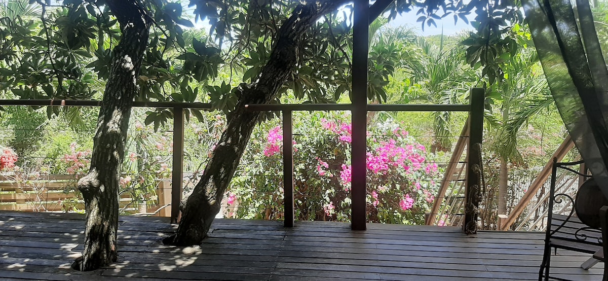 La terrasse fait sortir un avocatier du deck...ombrage naturel... le bruit de la mer comme fond, quartier calme, ambiance tropical mais tout prêt d'une plage, à pieds 1 minute et demi. Bungalow sur pilotis, dans jardin fleuri. Chambre climatisée, petit salon avec un canapé, TV cablé, tout confort pour cuisiner, grille pain, micro onde. Avec le chauffe eau solaire, si pendant 2 ou 3 jours il n'y a pas du tout de soleil, l'eau sera tiède, c'est rare quand même!