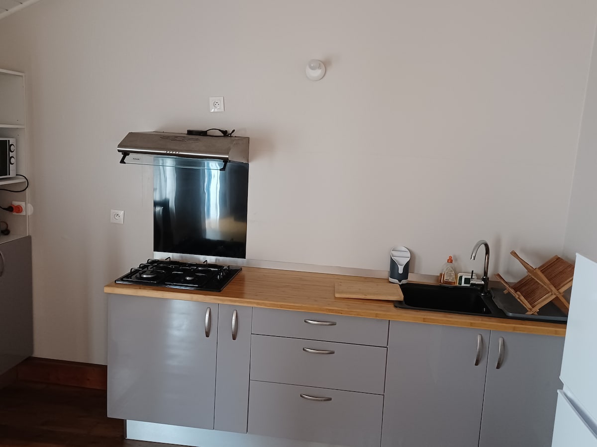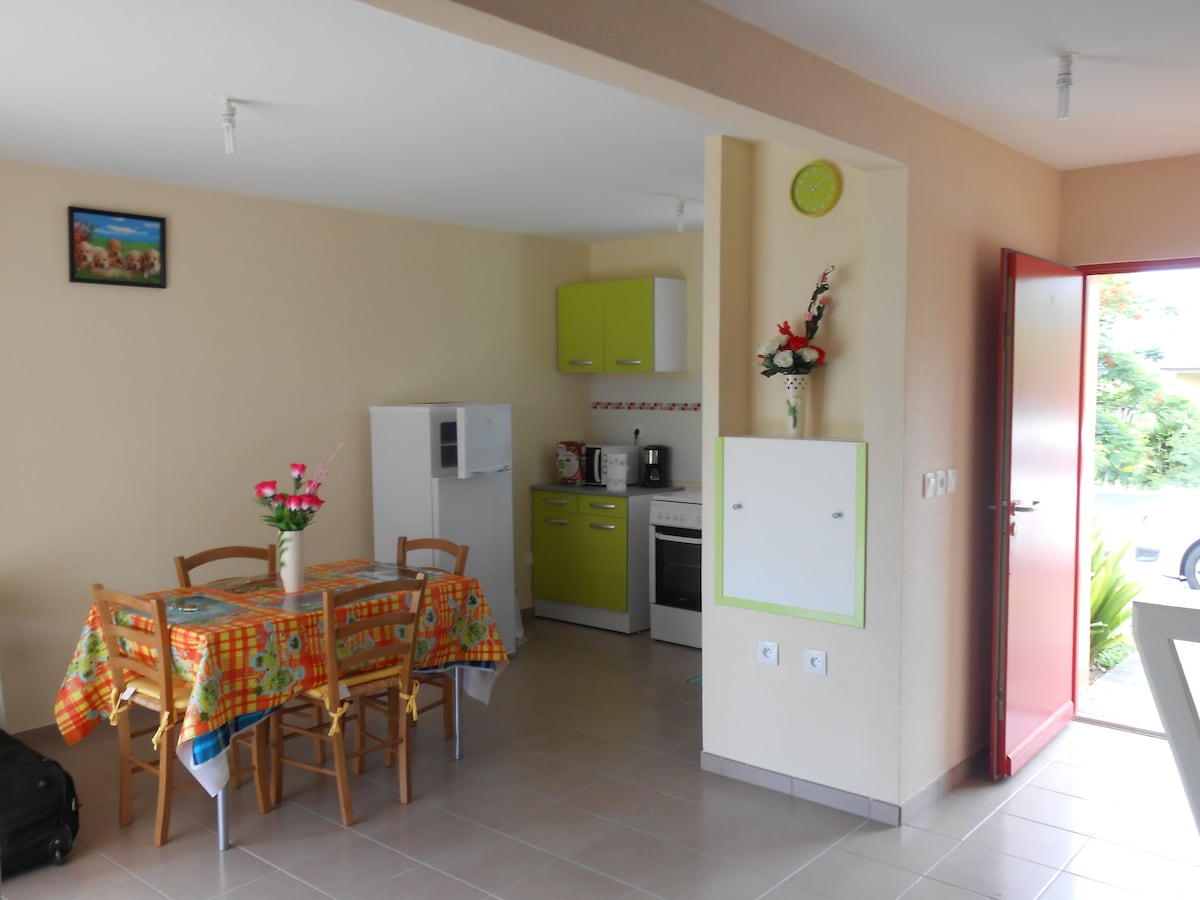 LE MANIOC Située en plein Cœur de notre iles si accueillante, dans une petite résidence locale, non loin de tout commerce ( boulangerie, épicerie, pharmacie, docteur etc.….). Nous vous proposons une chambre climatisé avec rangement, un salon avec un canapé convertible pour se détendre après une belle journée d'exploration. Une cuisine équipée ouverte, une salle de bain avec w.-c. et une terrasse équipée d'une bar extérieur.