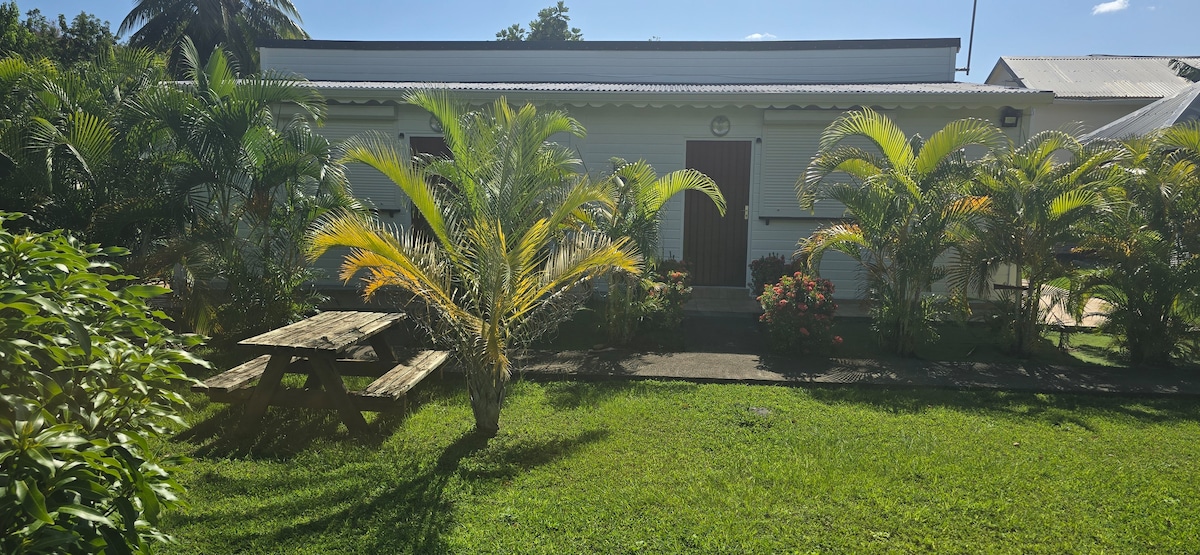 T2 paisible à la campagne. Proche des commodités. À 7km de l'aéroport. 1 salon avec canapé convertible. 1 cuisine équipée. 1 coin repas. 1 chambre climatisée avec placard. 1 salle d'eau. 1 espace détente tranquille qui permettra de prendre le petit-déjeuner ou encore de faire un barbecue. Possibilité d'accueillir 2 personnes supplémentaires: 7 euros par personne/ par nuit