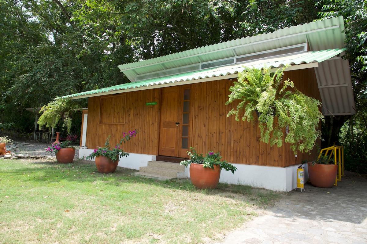 Amplia, confortable ideal para descansar con tu pareja, pese a estar rodeada de naturaleza y ser un sitio muy tranquilo, se encuentra cerca de restaurantes, almacenes y tiendas. La piscina cuenta con playita ideal para broncearse. Es compartida con los anfitriones y los huéspedes (6) de otra cabaña.