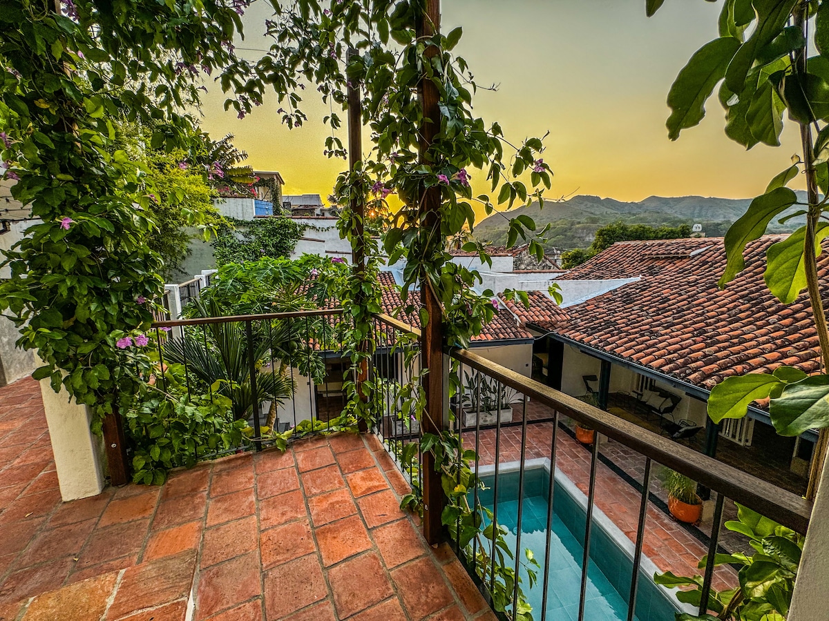 *ENCANTADORA* Disfruta del mejor viaje en familia o con amigos en esta maravillosa casa en el Centro Histórico, lo suficientemente cerca para llegar caminando a las principales atracciones de Honda, pero lo suficientemente lejos del bullicio para disfrutar del canto de los pájaros y de un buen descanso. Sumérgete en la piscina, que es el corazón de la casa, relájate y disfruta de un hermosa vista al cerro. El precio incluye aseo diario.